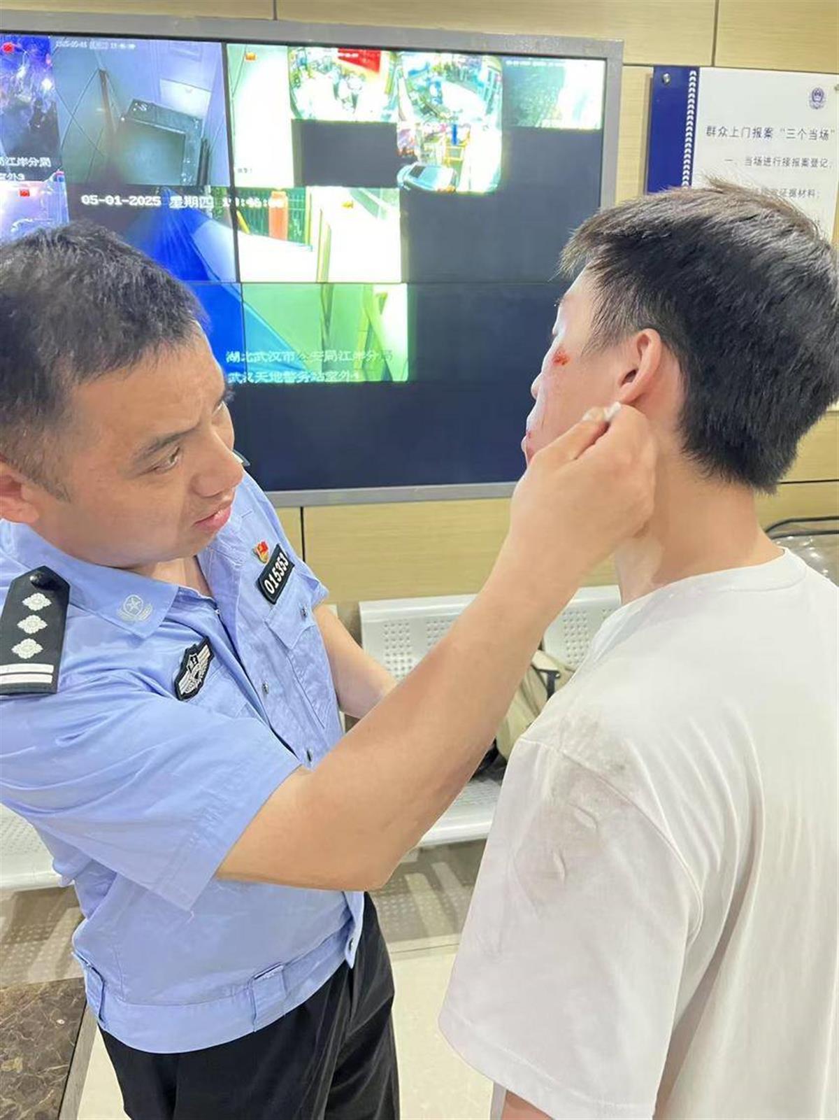 “五一”假期首日,武汉天地商圈热闹非凡。武汉市公安局江岸区分局第一警务站教导员金峰和中队长杨凯在值班时,突然看到一名骑自行车的年轻小伙摔倒在中山大道上。两人上前将小伙扶起。只见小伙脸上、胳膊和腿上多处擦伤渗血,他们随即将小伙带到警务站,杨凯指引小伙清理伤口灰尘,金峰取出医药箱并细心处理。处理完伤口后,民警还不忘反复叮嘱小伙注意骑车安全,建议去医院进一步检查。小伙感动不已,连声道谢。