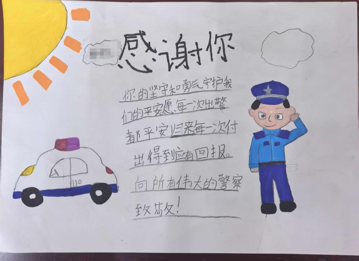 民警看到,感谢信上,画着太阳、警车和民警。孩子用稚嫩的笔迹写道:感谢你,你的坚守和勇气守护我们的平安。愿每一次出警都平安归来,每一次付出得到应有回报。向所有伟大的警察致敬!
