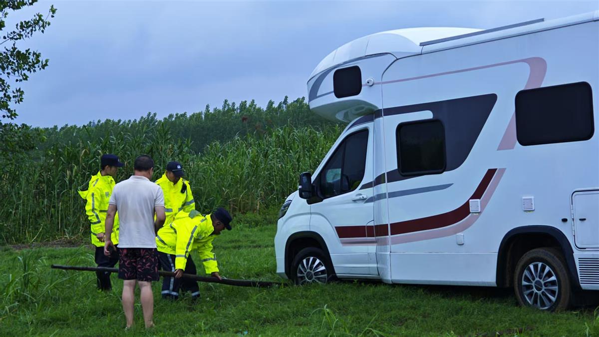 5月8日,江城武汉遭遇强对流天气,江心岛天兴洲风雨交加。武汉市公安局洪山区分局天兴乡派出所民警在巡逻途中,紧急救援一辆被困的露营房车,帮助来自天津的游客团队成功脱险。