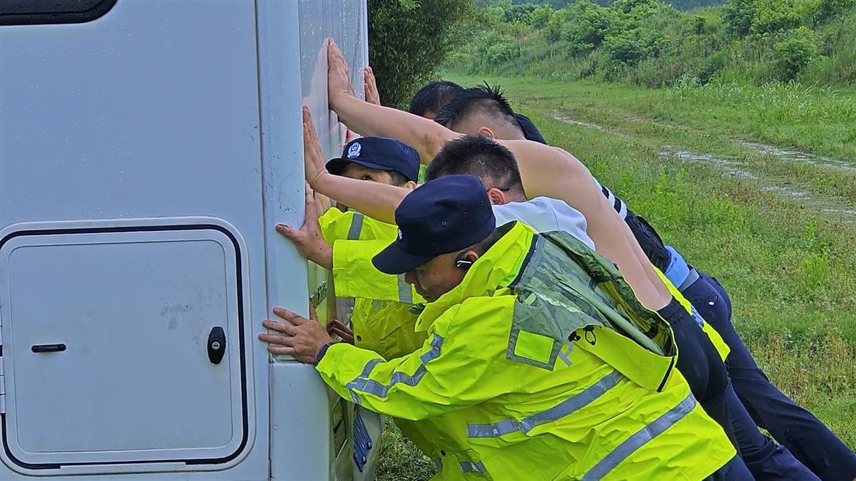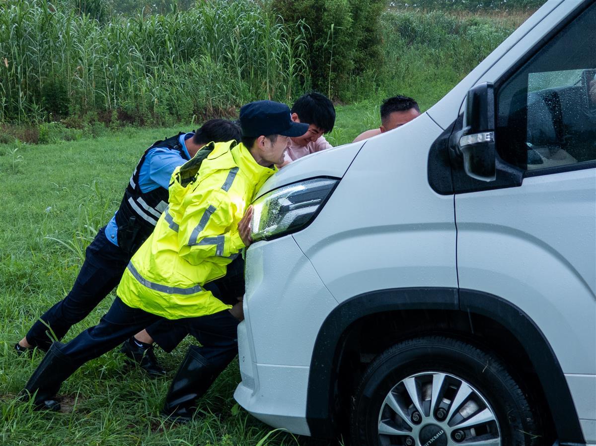 “注意油门控制,不要一味猛踩!”民警易强找来木板,垫在车轮下方增加摩擦力。副所长陈胜权招呼民警辅警和张先生的同伴一起推车。众人在风雨中喊着号子推车,但无奈车辆太重,车轮仍在空转。