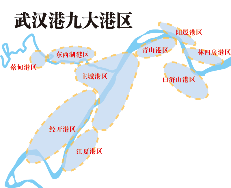 规划明确,武汉港并不是一个港。它有9个港区,分别是阳逻、经开、白浒山、江夏、主城、青山、林四房、蔡甸以及东西湖港区。