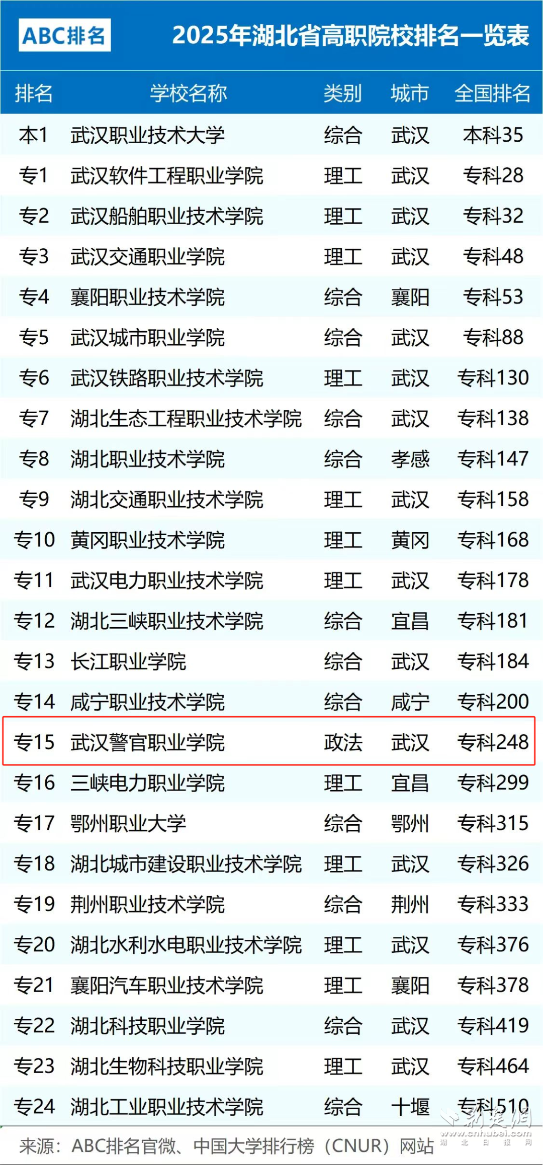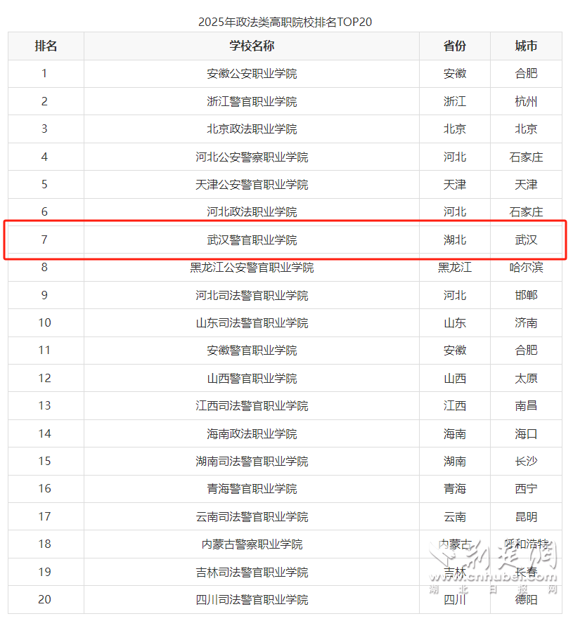 5月6日,中国大学排行榜(CNUR)网站正式发布了2025年ABC中国高职院校排名,覆盖全国范围内1000所高职专科院校(含民办高职院校108所)。武汉警官职业学院排名248位,较2024年提升了11位。其中,全国政法类高职院校中排名跃升至第7,在湖北省高职院校中排名位居第15位。