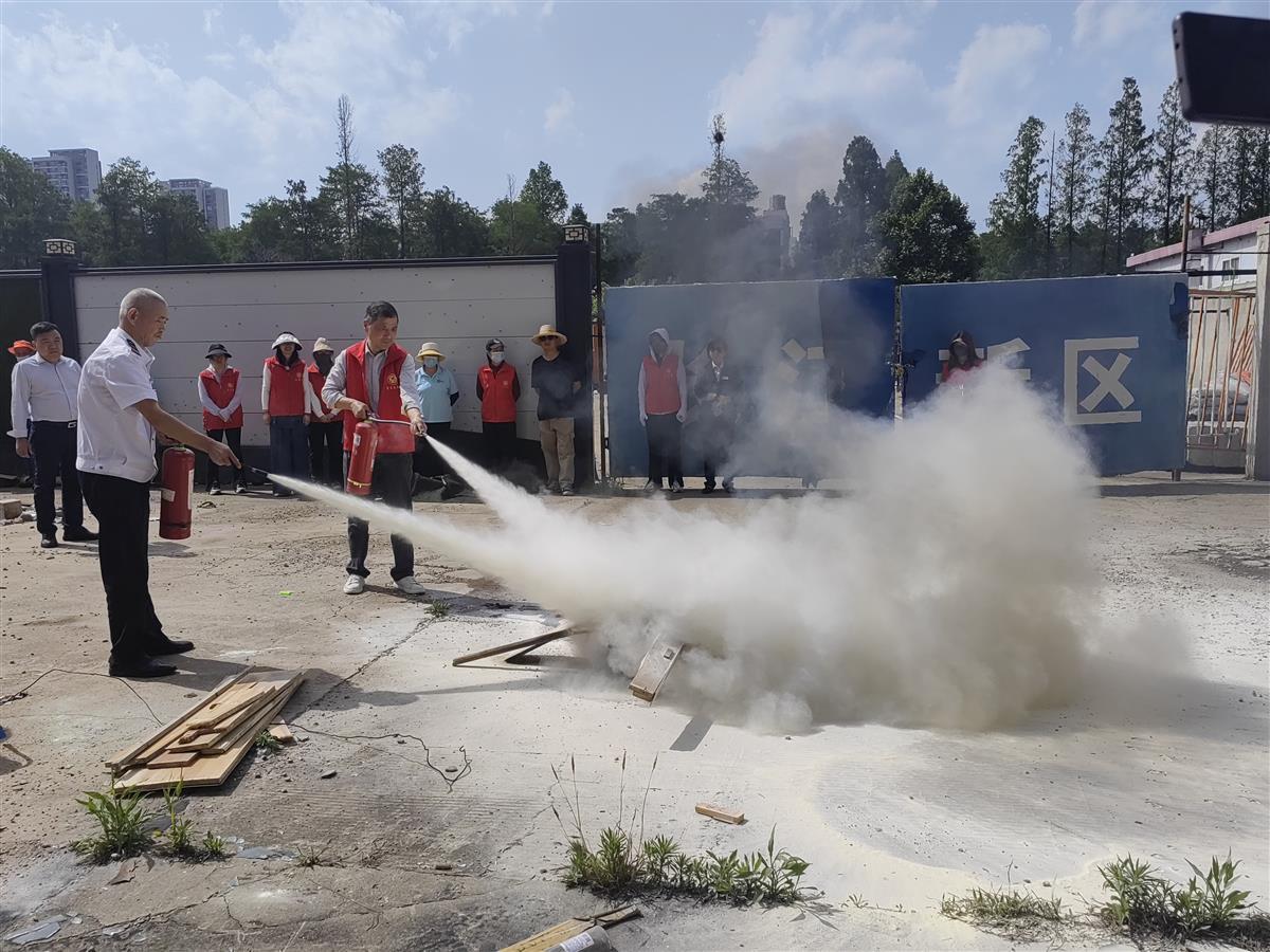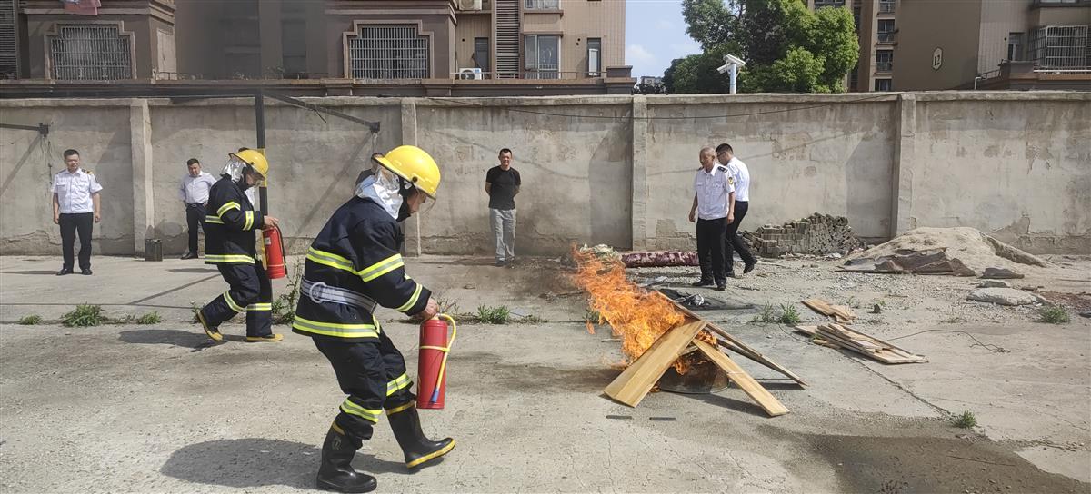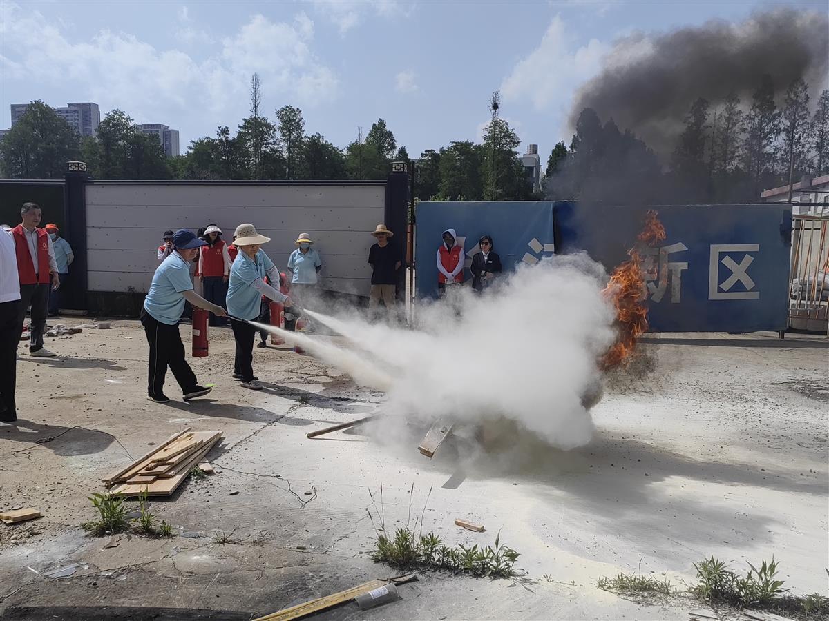 本次活动由辖区商铺门店业主、居民代表、平安苑社区和嘉源忠兆物业公司全体工作人员共30余人参加。活动安排包括消防安全知识讲解、消防器材使用培训、火灾应急处理流程操练等。演练现场,物业公司组织参加人员穿戴好消防防护服,按照先前的演练步骤,摆好消防器材,列队整齐划一,由社区副主任朱良斌同志向参加人员详细讲解了灭火器和消防水袋等器材的使用方法和注意事项,如何排查和防范身边可能存在的灾害隐患,以及火灾突发的同时如何安全逃生和应急疏散等生活常识,并就灭火器“一提、二拔、三瞄、四压”的四步使用法进行了现场演示。讲解完有关注意事项后,演练正式开始,现场指定木材被点燃后,所有参与人员根据指导要领分组练习,严格按照消防实战要求,站在上风口方向,将灭火器喷口对准火焰根部,有条不紊地进行灭火操作,顺利完成消防演练全过程。