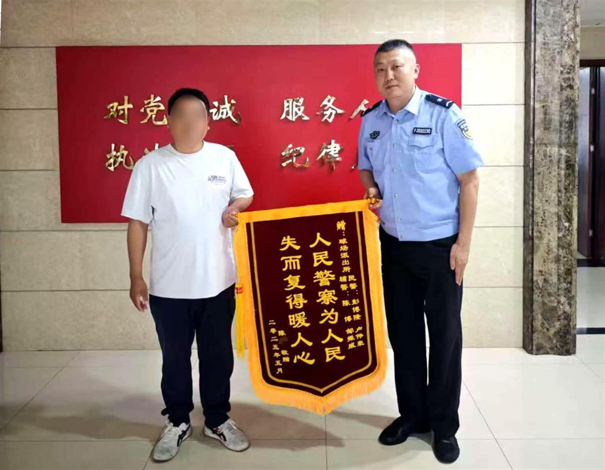 5月7日上午9时许,民警彭博隆联系陈先生来到派出所。陈先生领回手推车,看到衣物和电话手表完好无损,激动地向民警、辅警道谢。次日,陈先生带上锦旗来到派出所,再次感谢民警和辅警。