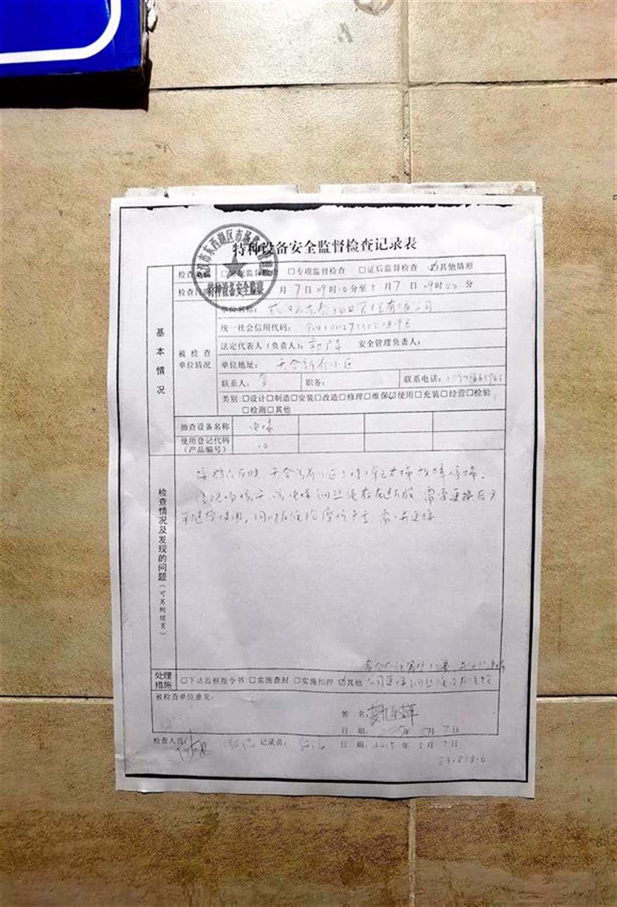 电梯轿厢门左侧有电梯内部损坏部件的照片。两部电梯中间的墙面上,还张贴着一张由特种设备安全监督部门盖章的检查记录表,检查结果与前面的提示内容相印证。因此,目前业主上下楼,只能使用另一部电梯。