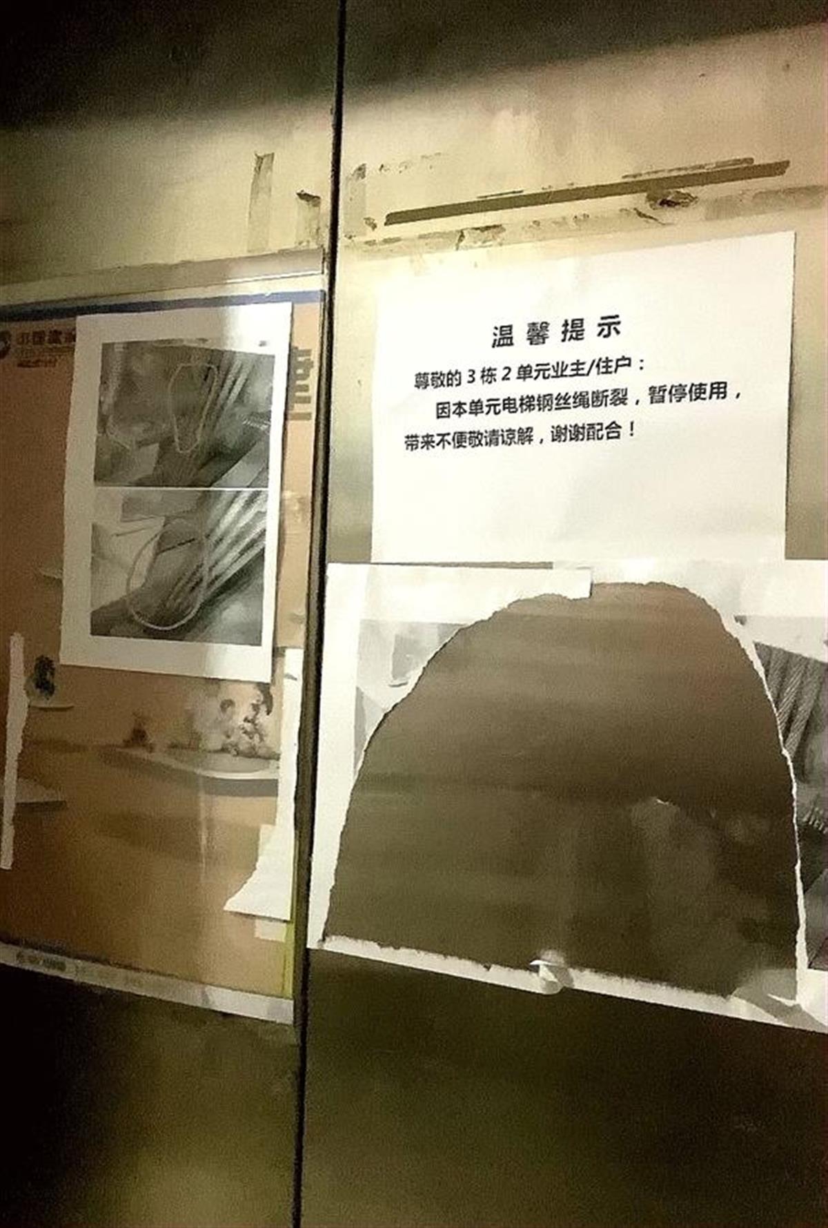 当天下午,匡先生带记者查看了位于该小区三栋2单元的故障电梯。该电梯轿厢门右侧贴着一张未署名和标注日期的“温馨提示”,告知业主该电梯因钢丝绳断裂而暂停使用。