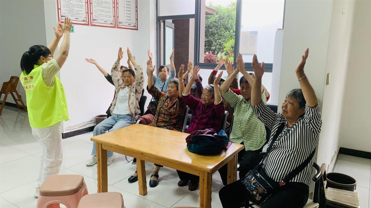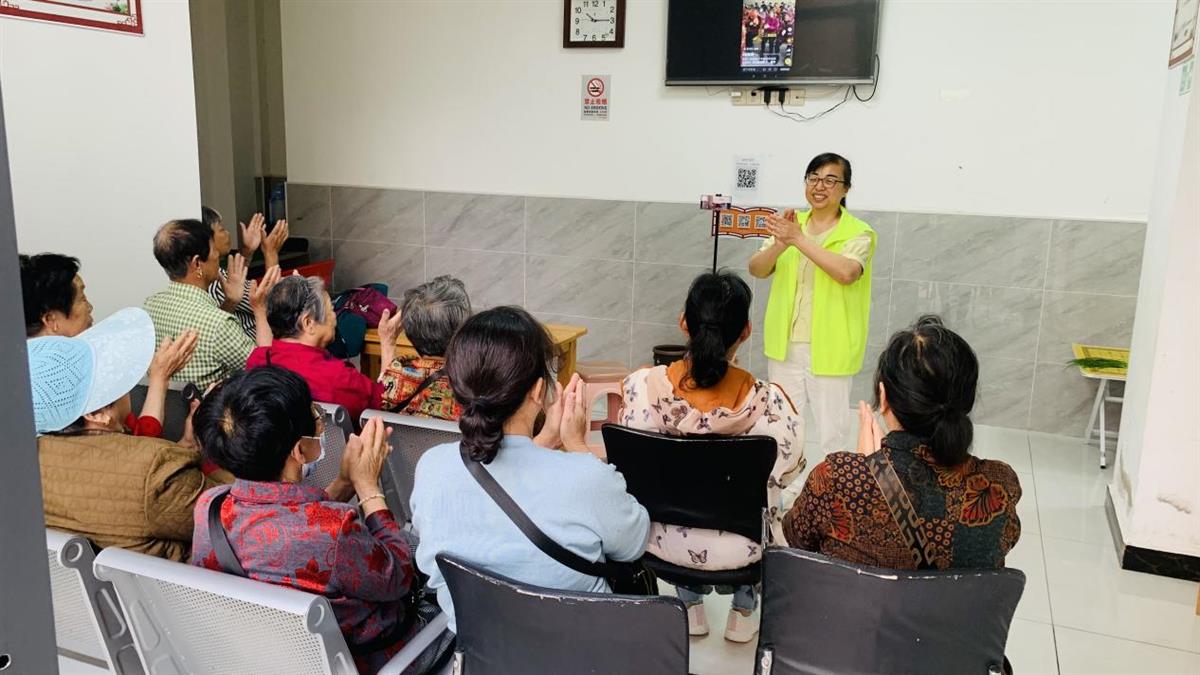 活动伊始,为活跃现场气氛、锻炼老人们的手脑协调能力,社工带领大家做起了趣味拍手操。伴随着轻快的音乐和电视屏幕上的示范动作,老人们跟着节奏拍手、拍肩,动作整齐而充满活力。“一二三拍拍手,健康快乐天天有;一二三拍拍肩,我们健康要领先!”欢快的口号声回荡在活动现场,引得老人们开怀大笑。94岁的杨婆婆幽默地说道:“活到一百一?那不成老妖精啦!”一句玩笑话,瞬间点燃了全场的欢乐气氛,也展现了老人们乐观豁达的精神风貌。