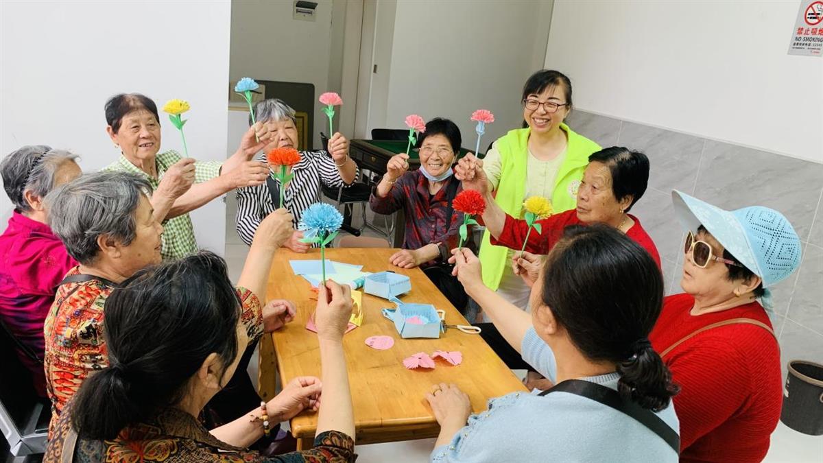 活动中,大家互相帮助、交流心得,现场其乐融融。六层花瓣叠出饱满的花型,翠绿的叶片衬着娇艳的花朵,一朵朵康乃馨渐渐在手中绽放,仿佛诉说着对母亲的祝福与感恩。活动结束时,老人们捧着自己的作品,脸上洋溢着自豪与喜悦,纷纷合影留念,记录下这充满温情的瞬间。