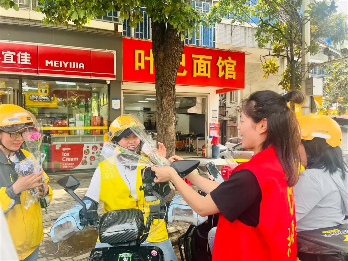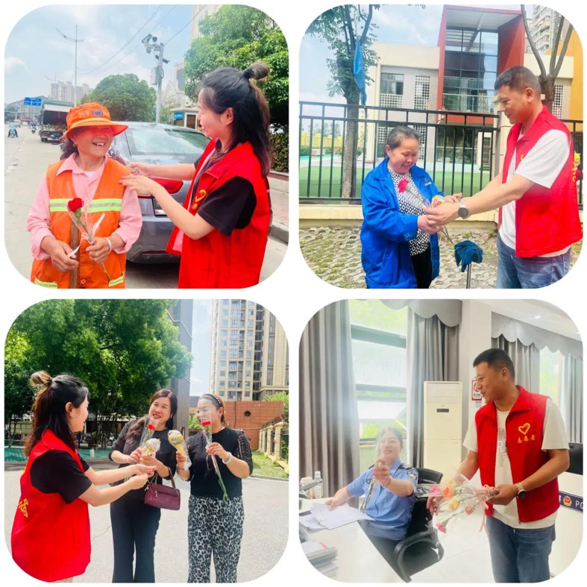 为向辛勤付出的户外女性工作者致以敬意与祝福,5月9日,武汉长江新区武湖街道青龙社区志愿小分队走上街头,开展“温情母亲节,致敬‘她’力量”公益活动,为女性快递员、外卖骑手、环卫工人等群体送上康乃馨花束和手工艾草锤。