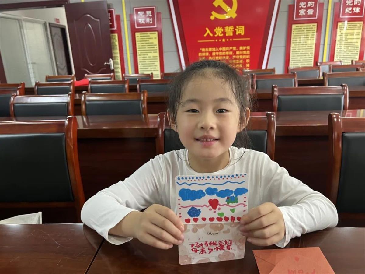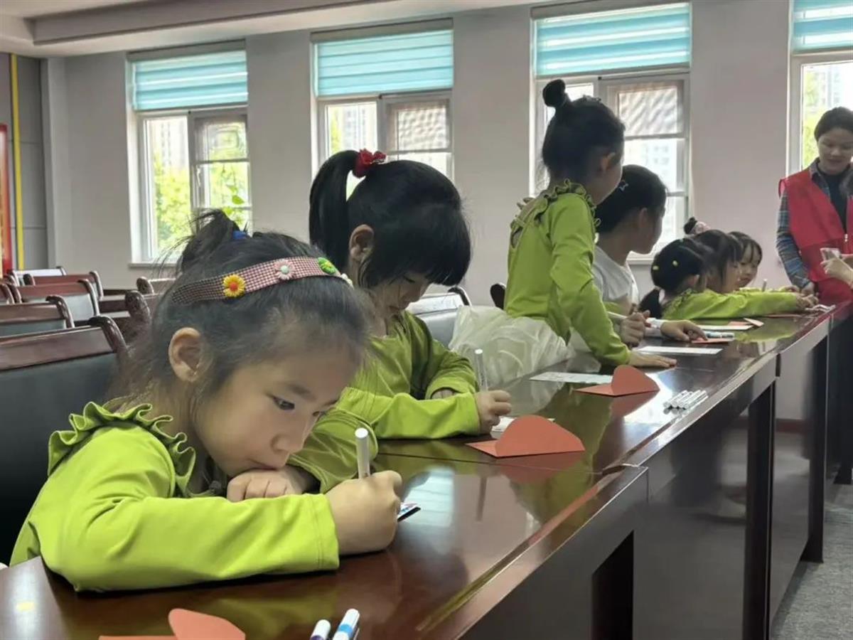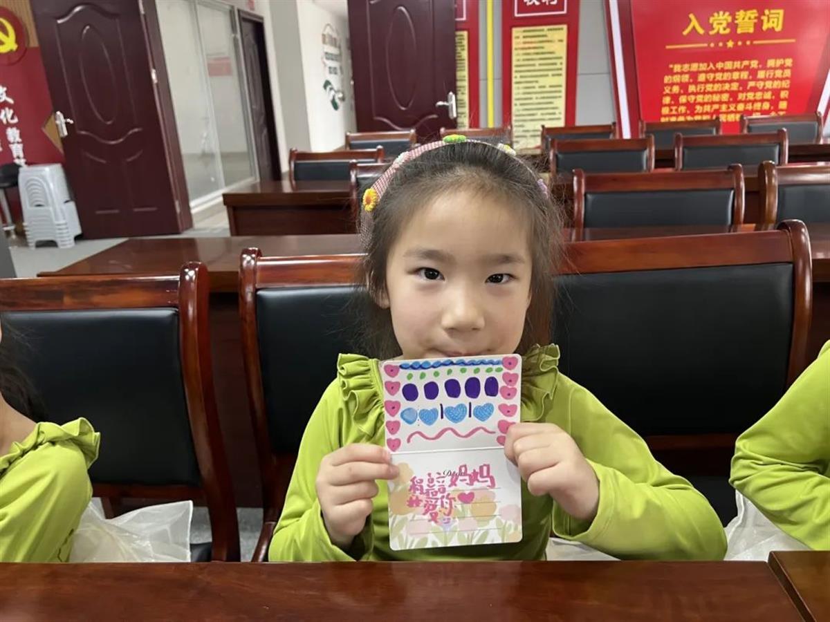 活动现场,长桌上整齐摆放着贺卡、水彩笔、贴纸等琳琅满目的手工材料,社区工作人员用温柔的语调引导孩子们,以绘画或书写的方式表达对妈妈的感谢。孩子们立刻化身小小艺术家,有的用贴纸拼贴出妈妈的笑脸,有的用蜡笔涂抹出灿烂的花海,还有的歪歪扭扭地写下“妈妈我爱你”。当稚嫩的笔触遇上绚丽的色彩,一张张贺卡渐渐被填满,跳动的爱心、绽放的花朵,每一处细节都流淌着孩子们对母亲最炽热的爱,整个活动室都弥漫着暖暖的爱意。