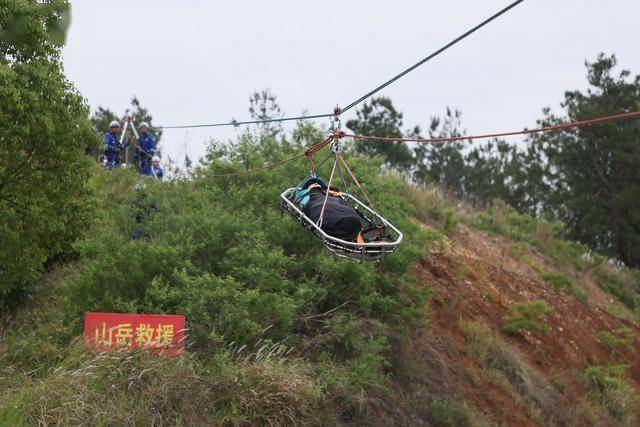 在山岳救援演练现场,救援人员转运模拟伤者。记者陈其雄 摄