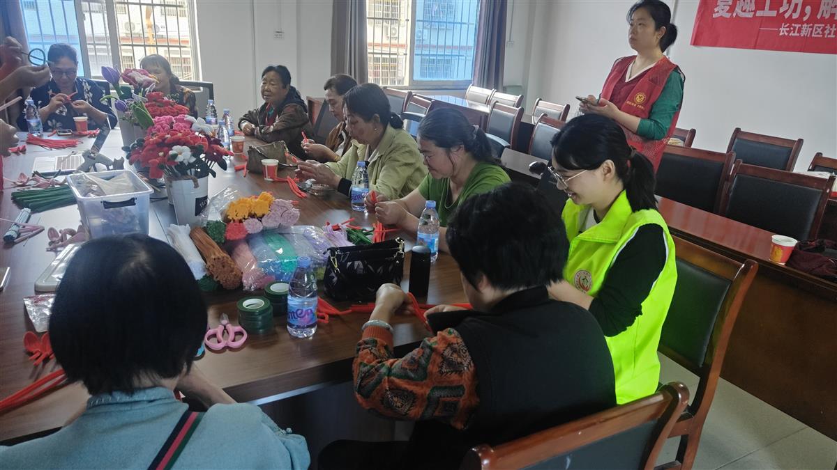 活动现场洋溢着温馨愉悦的氛围。在手工花制作区,社工和志愿者耐心细致地为居民们讲解康乃馨、郁金香、玫瑰等花卉的制作技巧。从花瓣裁剪到造型塑形,再到最后的装饰组装,每位参与者都全神贯注,用五彩斑斓的扭扭棒、丝带等材料,精心制作出一束束栩栩如生的手工花。“自己动手做的花比买来的更有意义,我要把这束花送给我的妈妈,感谢她多年的养育之恩。”李女士捧着刚做好的康乃馨,脸上洋溢着幸福的笑容。