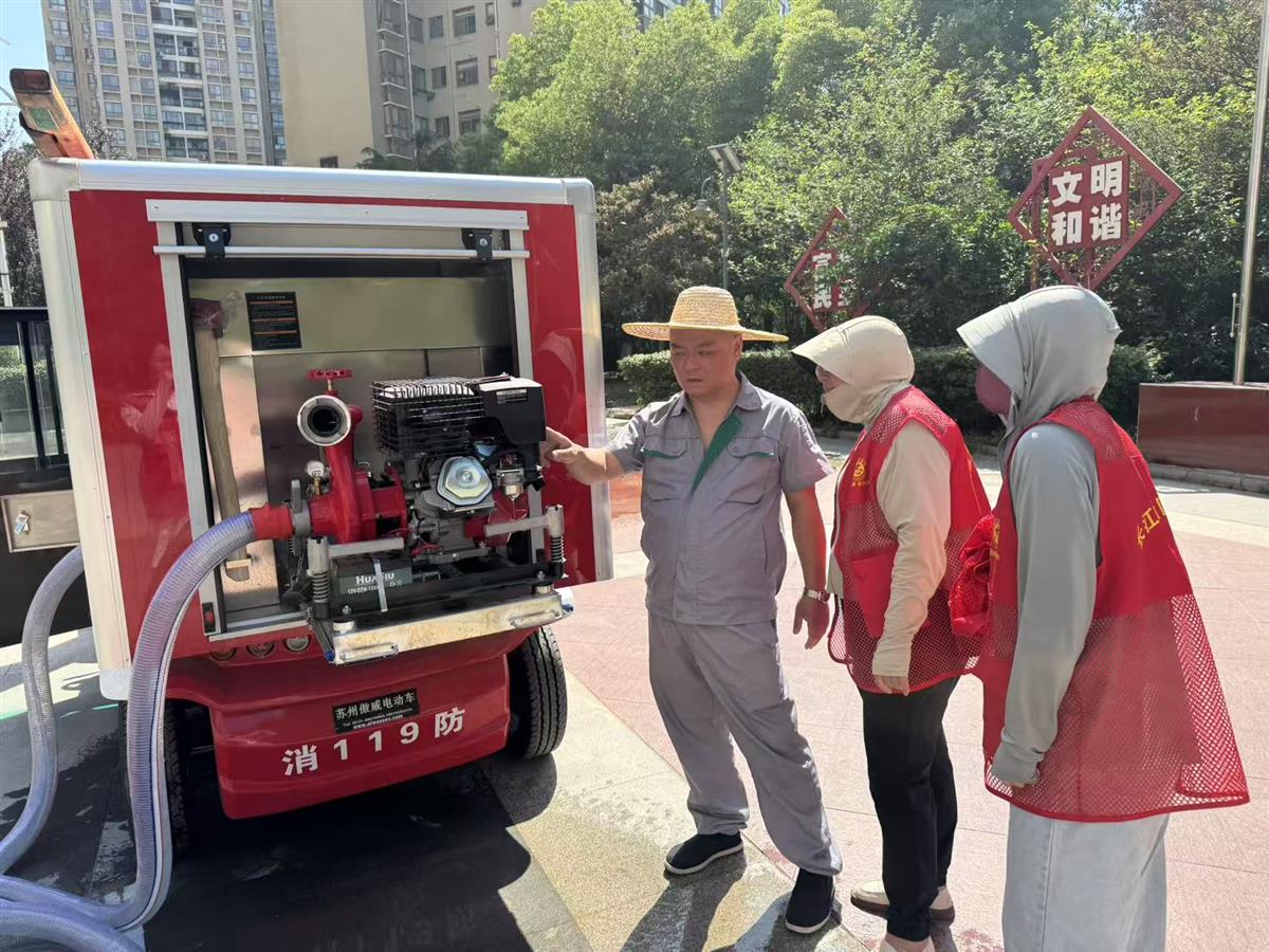 在实操环节,安全员以干粉灭火器为教具,分步演示了“一提、二拔、三握、四压”四步操作法,并组织参训人员分组进行了油盆灭火实战演练。针对高层住宅的特点,特别演示了社区微型消防车快速连接水袋、高压喷水灭火等专业操作。志愿者与物业人员在指导下,手持消防水枪进行模拟灭火作业,通过亲身体验掌握专业消防设备使用方法,切实提升应急处置能力。