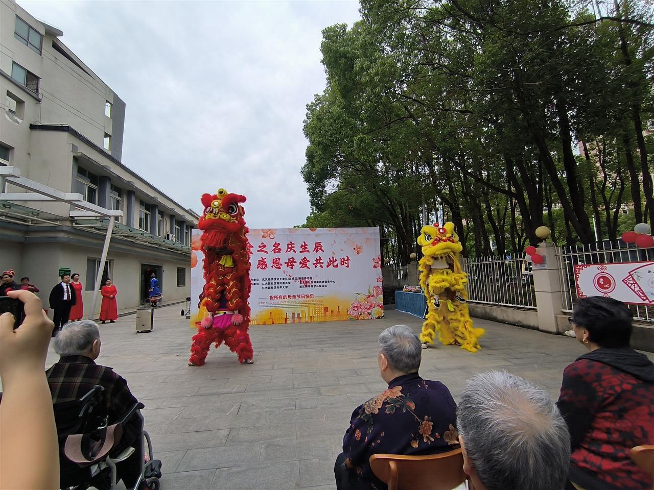 活动伊始,武汉商学院梦马志愿服务队的志愿者们带来了一场精彩绝伦的舞狮表演。红黄两头可爱的雄狮在欢快的鼓点声中上下翻腾、摇头摆尾,时而跳跃、时而翻滚,还时不时与现场的老年人亲密互动,逗得老人们开怀大笑。表演结束后,大家纷纷与雄狮合影留念,现场充满了活力与欢乐的氛围。