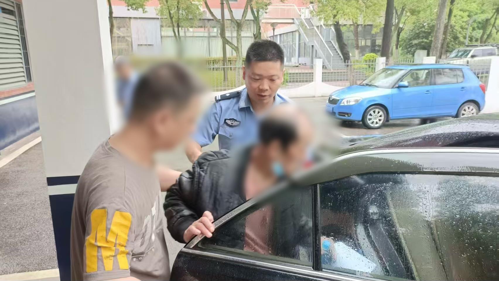 老人因长时间淋雨失温,整个人状态较差,眼神迷茫。见无法进行有效沟通,民警决定先将其搀扶上警车,并带回警务站内。