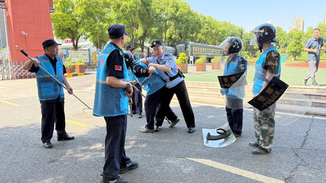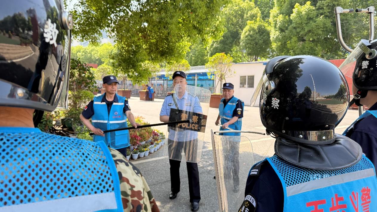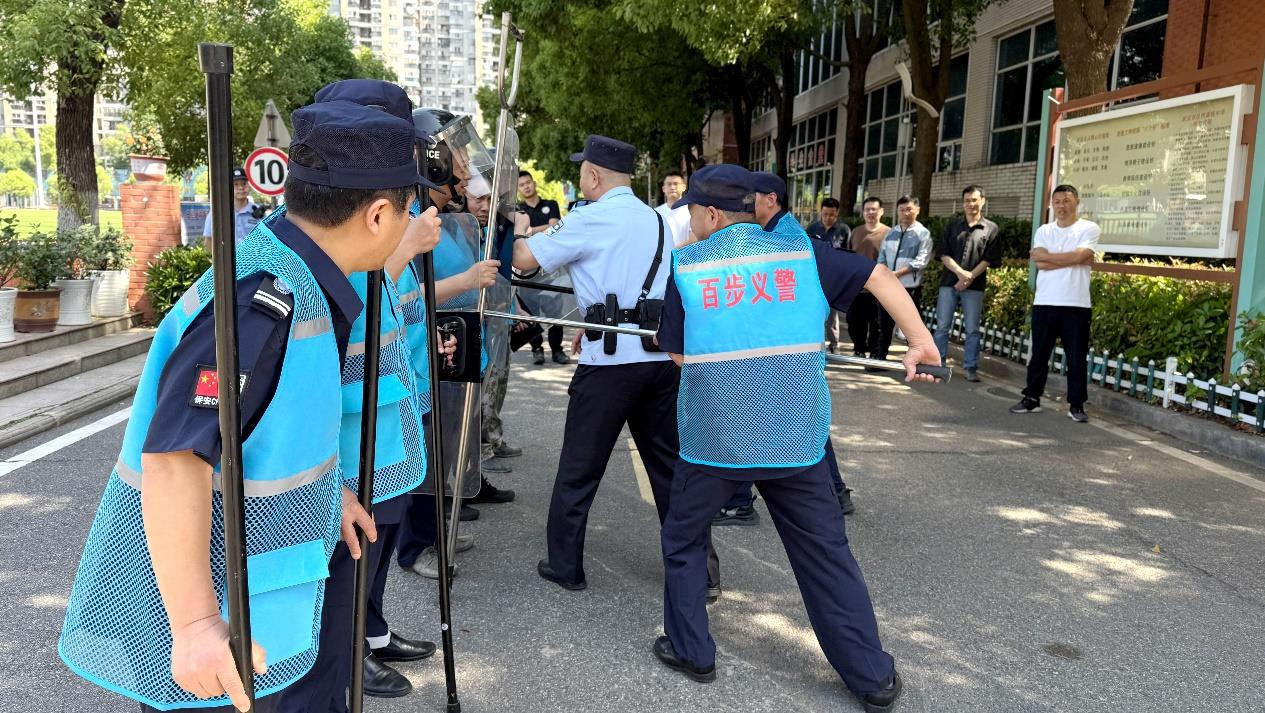 “今天我们采取3人最小应急作战单元,可以有效先行处置突发事件。”民警沈胜文一边讲解,一边示范。现场10余名义警安保人员通过跟学,掌握技巧,随后开展现场演练。