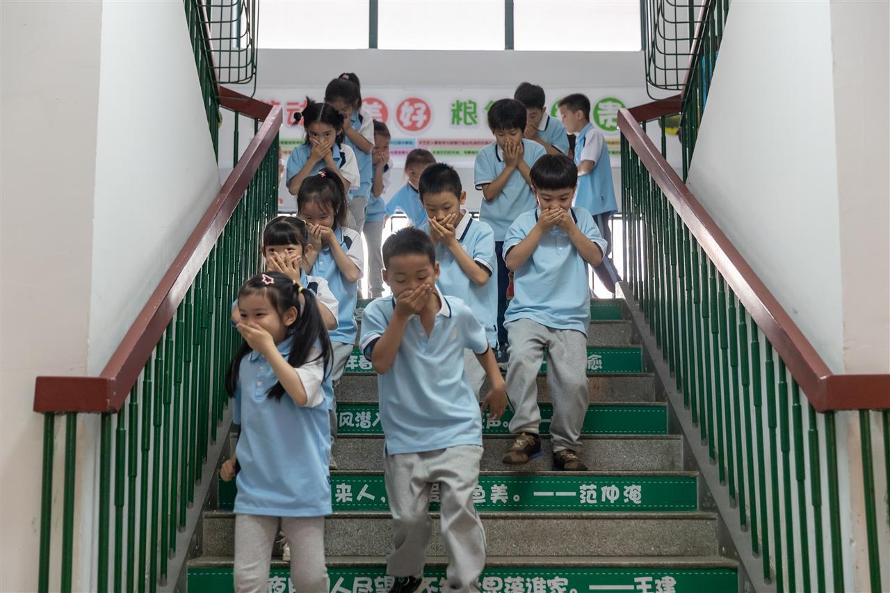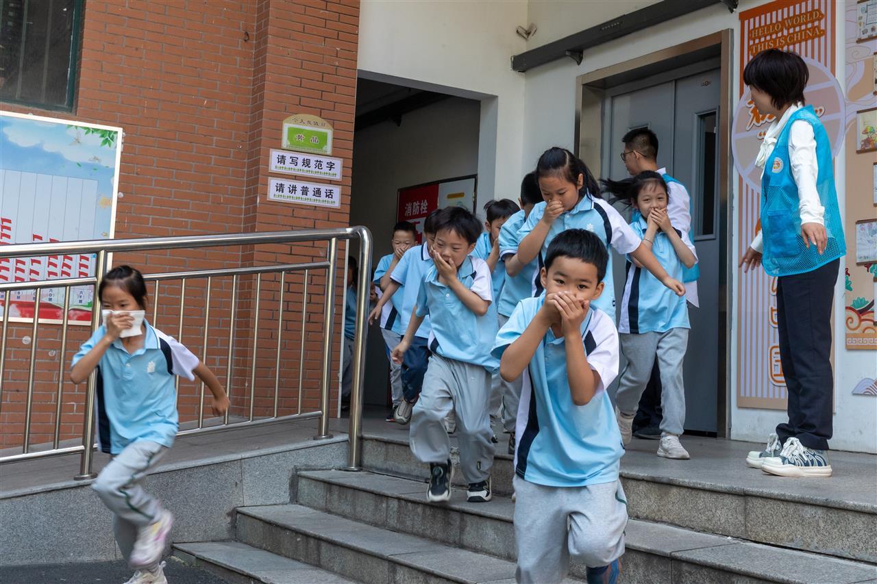 早上10点,随着急促的警报声响起,模拟教学楼突发火情的应急疏散演练正式启动。在消防员与教师的引导下,全校千余名学生用湿毛巾、袖子等捂住口鼻,弯腰低姿沿指定的疏散路线快速撤离,安全到达操场指定集合地点。各班老师负责清点人数并上报总指挥,确保无一人滞留。