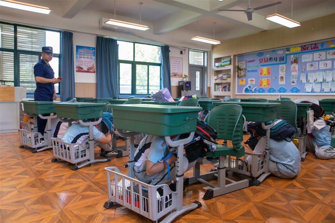 “地震来了我们应该怎么办?”在科普讲座环节,消防员还带来一堂“理论讲解+实践操作”的精彩授课,深入浅出地讲解了火灾预防、地震避险、防溺水自救等知识。在消防员“代课老师”的引导下,同学们时而托腮思考,时而争相抢答,原本严肃的安全课堂变成了生动的互动剧场。课堂的最后,消防员“老师”还带领同学们完成了地震演习,指导学生们躲在课桌下的安全地带,将安全知识转化为可操作的“肌肉记忆”。