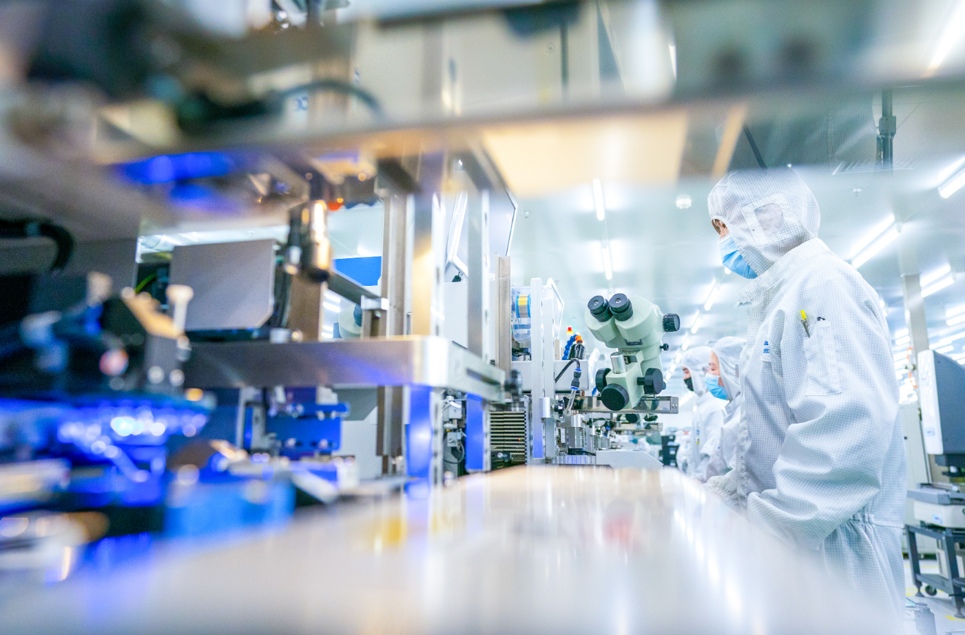 在位于光谷的光电器件研发制造商——武汉光迅科技股份有限公司生产车间内,工作人员在光模块生产线作业。新华社记者肖艺九 摄