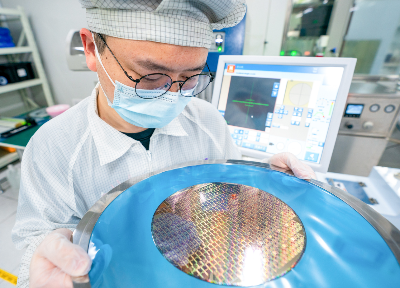 在位于湖北武汉的国家信息光电子创新中心,工作人员在无尘实验室内检查晶圆。新华社记者 肖艺九 摄