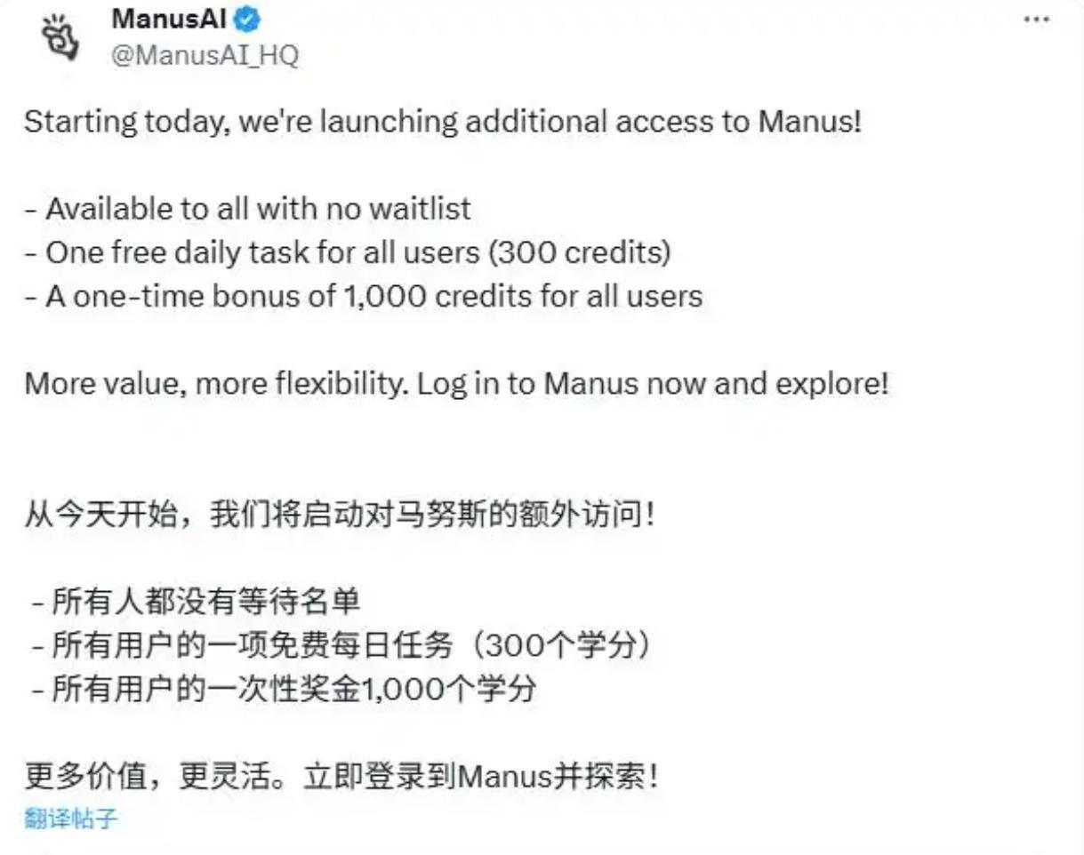 5月12日,Manus AI在社交平台发布公告,Manus向所有人开放,无需等待名单。