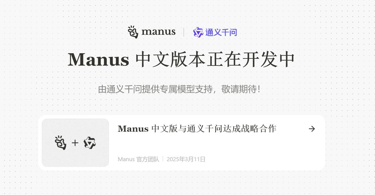 打开Manus官网显示,Manus中文版本正在开发中,此前已与通义千问达成战略合作。