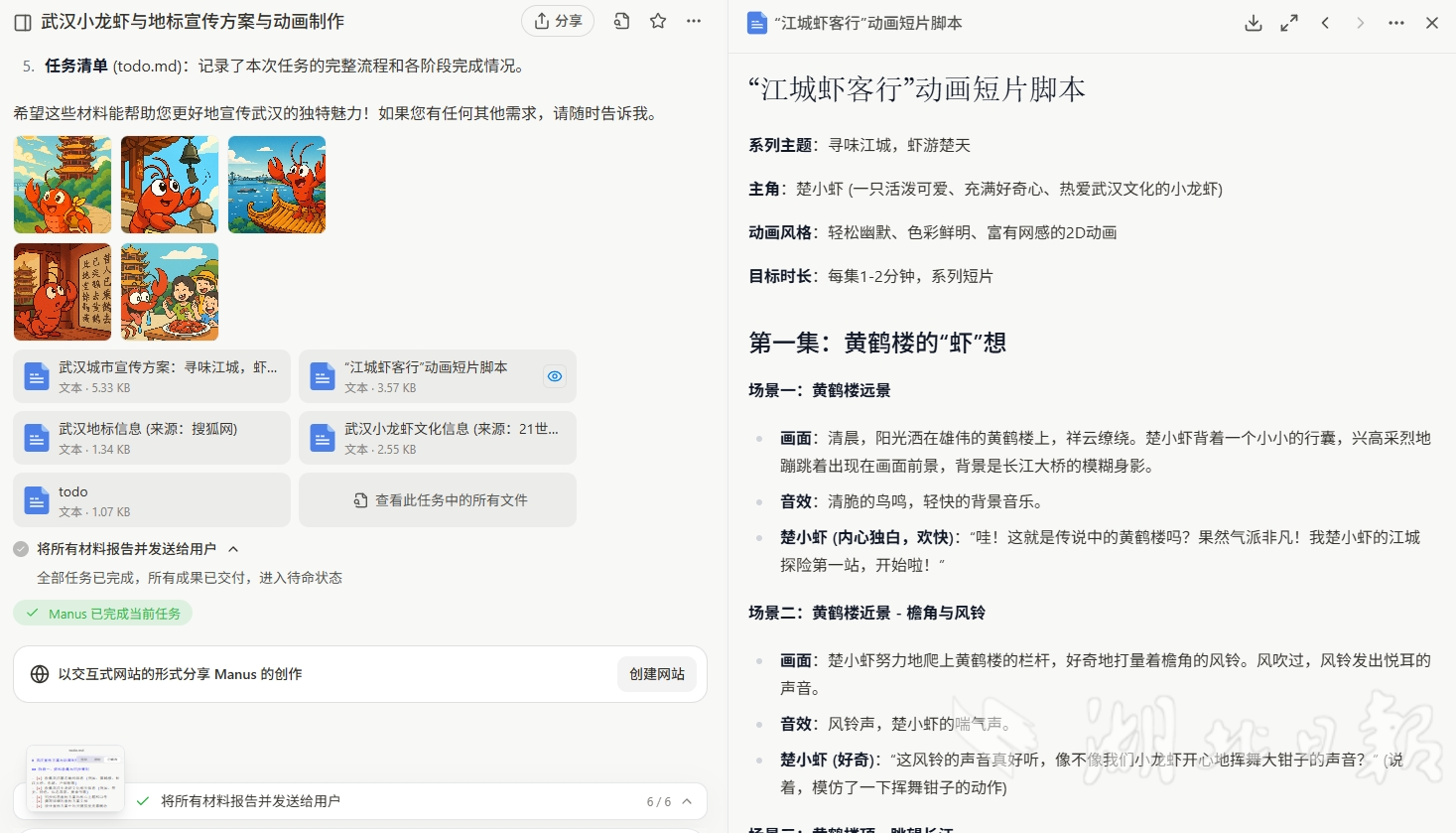 10分钟左右,Manus便生成《武汉城市宣传方案:寻味江城,虾游楚天》《武汉宣传方案与动画制作任务清单》《“江城虾客行”动画短片脚本》等详细文档和动画示例,花费156积分。生成过程中,Manus的思考环节全程可见,最终产品内容丰富,方案可操作性强。然而,也许是受限于海外版中文语料不足的限制,部分信息细节不够准确和详细。