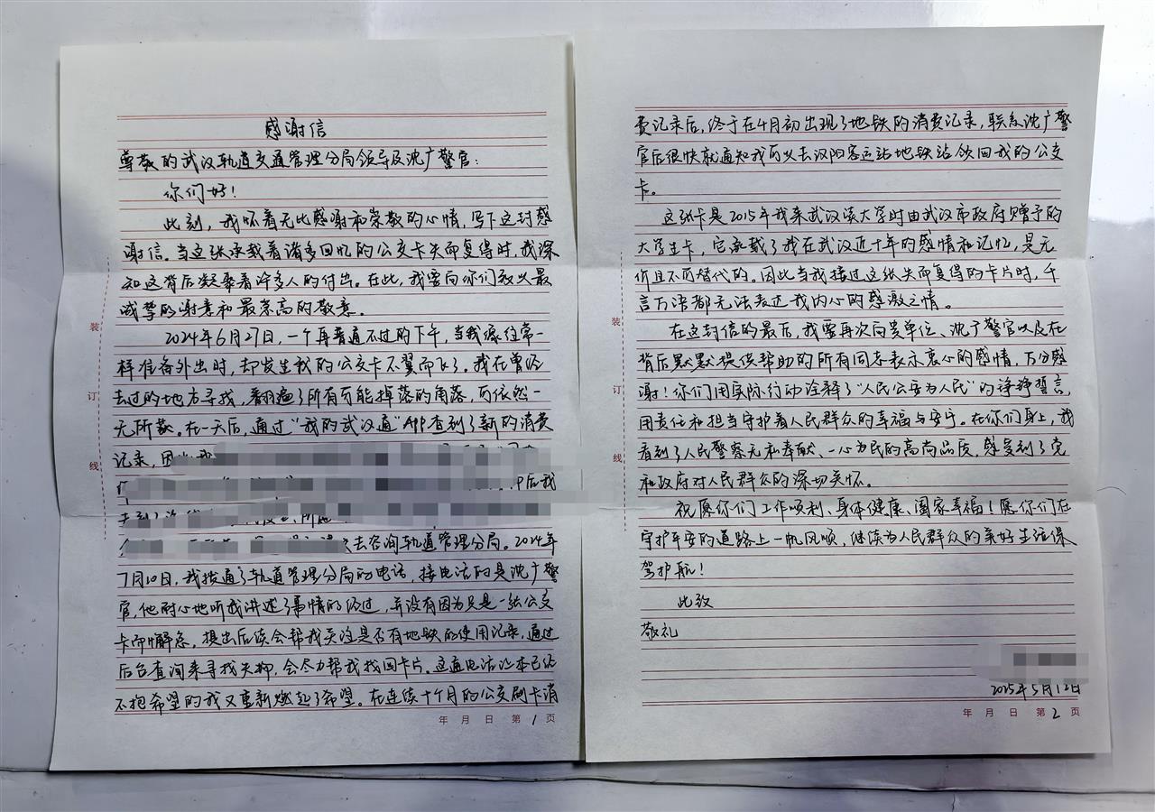 2024年7月10日晚,轨道分局指挥中心接到市民姚女士电话求助,称自己6月27日在东湖凌波门游玩时不慎将武汉通卡遗失,这张卡是2015年毕业后来武汉时赠送的大学生纪念卡,是自己在武汉工作10年的见证,具有十分重要的纪念意义,请求警察帮助寻找。