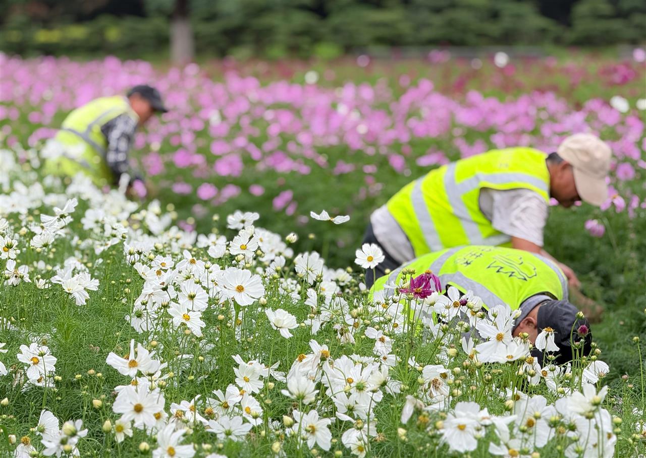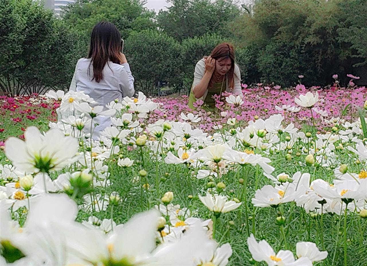 同期,韵湖公园2000平方米的波斯菊花海迎来盛放。通过科学选种、土壤改良与精准花期调控,粉若云霞、白似新雪的花簇与碧水绿树相映成趣,日均吸引数百市民打卡。东湖高新区城管局园林科从播种养护到病虫害防治等方面全程把控,近期更通过增设围栏、志愿者引导等方式倡导文明观景。相关负责人呼吁:“美景需共护,盼市民勿踩踏采摘,携手留存这份美好。”