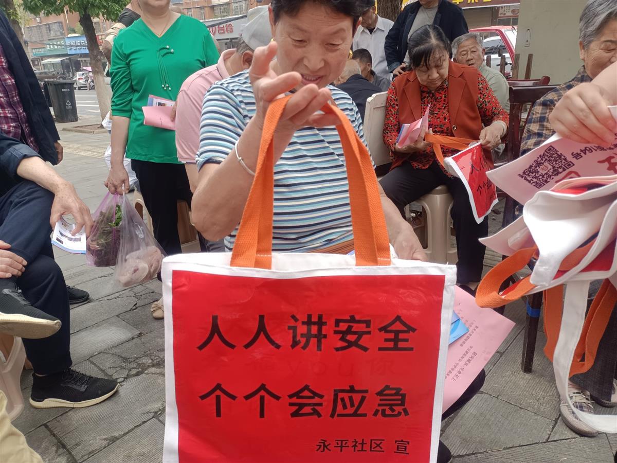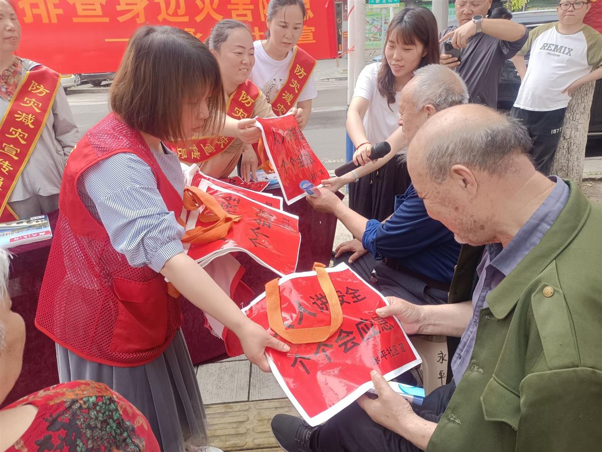 工作人员热情地向居民发放一本本宣传手册与一张张宣传单,这些资料如同装满智慧的安全知识“锦囊”,详细涵盖了地震、火灾、内涝、气象等常见自然灾害的预防知识、应急避险方法和自救互救技能,成为居民手中贴心的 “安全指南”。此外,印有防灾减灾标识的手提袋、围裙等实用小礼品也陆续送到居民手中,这些手小礼品不仅实用,还时刻提醒着居民关注防灾减灾,让安全知识融入日常生活。