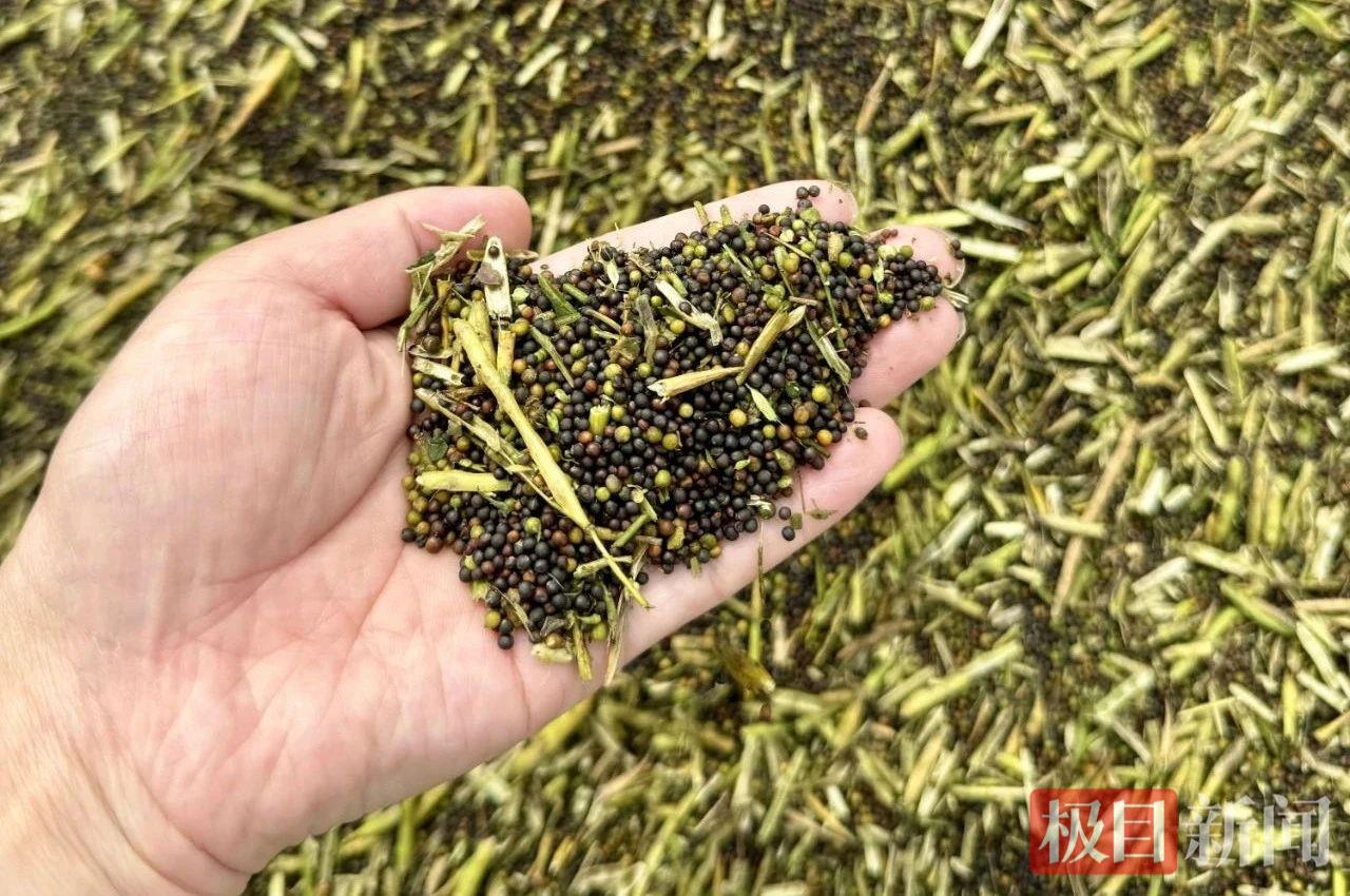 记者近日走进位于罗汉寺街伏南村的志同稻合农机专业合作社,只见600亩油菜基地里,饱满的油菜荚低垂枝头,农机手驾驶收割机在田间来回穿梭,在机器的轰鸣声中,油菜被迅速卷入,自动完成脱粒,油菜果壳和秸秆被碾成碎片也随即还田,化作天然肥料滋养土地,实现资源循环利用。收割后的油菜籽则被运往合作社工厂,在阳光下均匀铺洒晾晒,等待榨取金黄菜油。