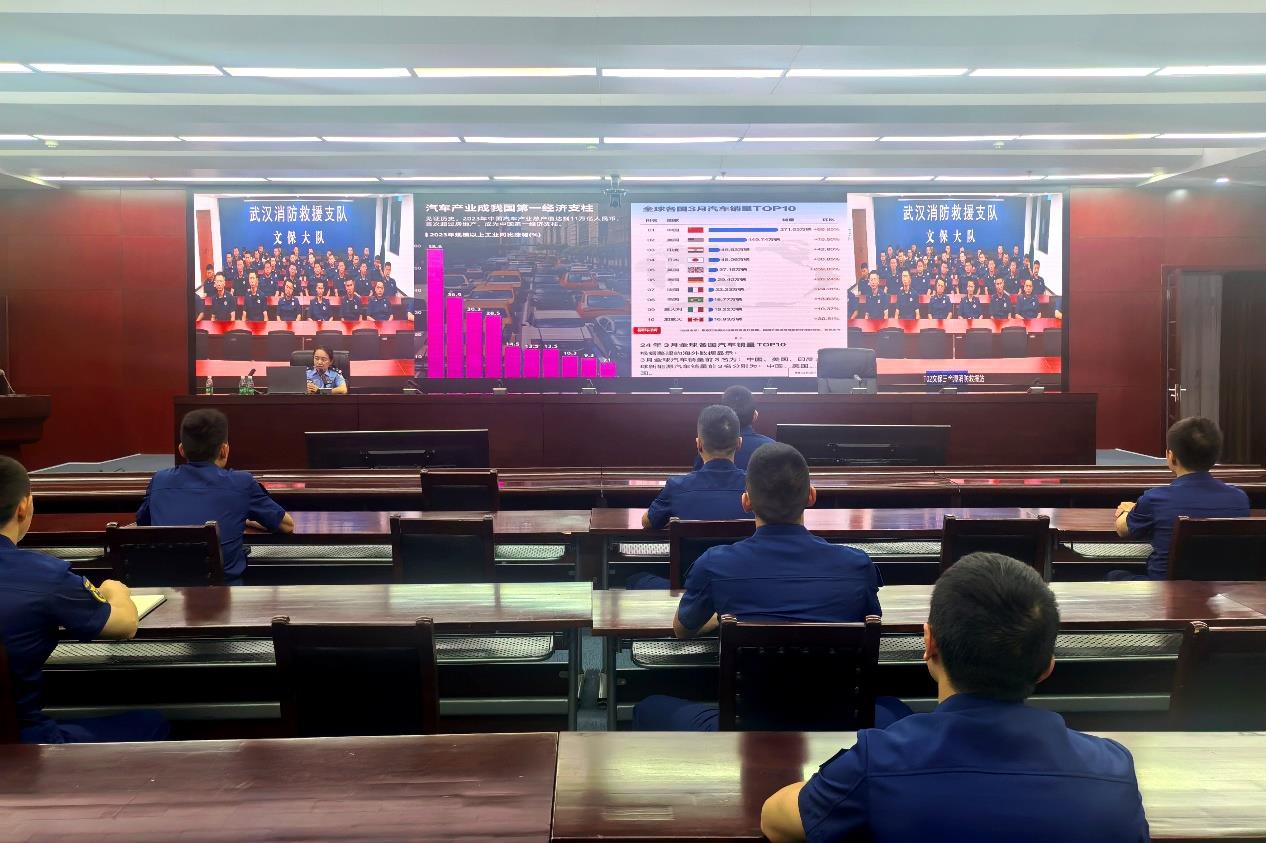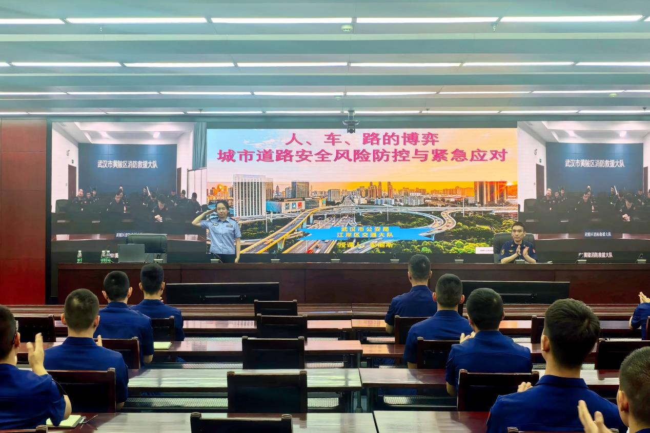 此次活动以武汉市消防救援支队为主会场开展现场教学,全市各区大队及消防站点通过视频会议形式同步收看学习。交通民警彭丽斯充分发挥交通安全宣讲作用,以精心制作的PPT课件为载体,采用图文展示与视频播放相结合的形式,结合城区交通流量特点、道路设施情况等城市交通安全现状,从理论与实际相结合的角度,深入浅出地向大家详细阐述特种车辆相关通行知识。