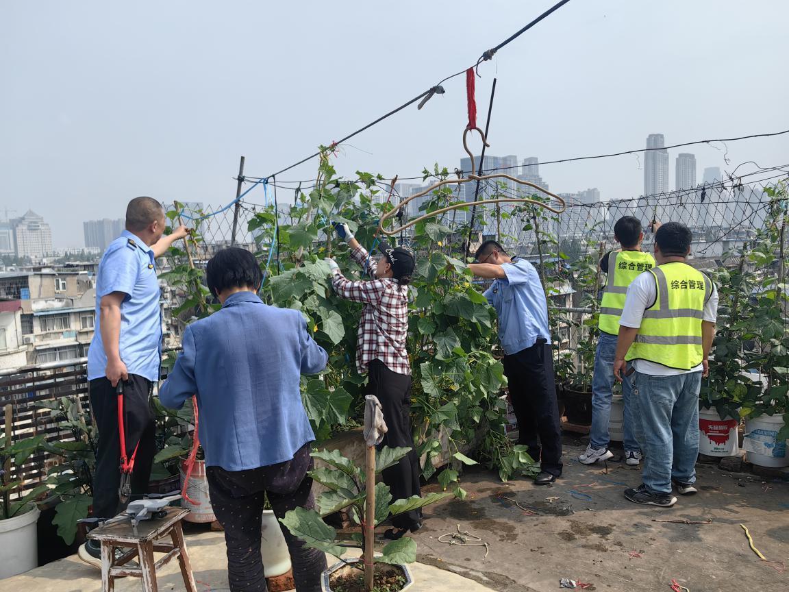 整治过程中,执法中心统筹协调,社区网格员逐户宣传政策,物业全力配合清运,形成“排查——劝导——整改——巩固”闭环机制。针对部分居民抵触情绪,工作人员耐心讲解法规、细化整改方案,既坚守原则又彰显温度。居民说:“以前楼顶堆满杂物,夏天异味大还招蚊虫,现在清理干净了,家里都敞亮了!”