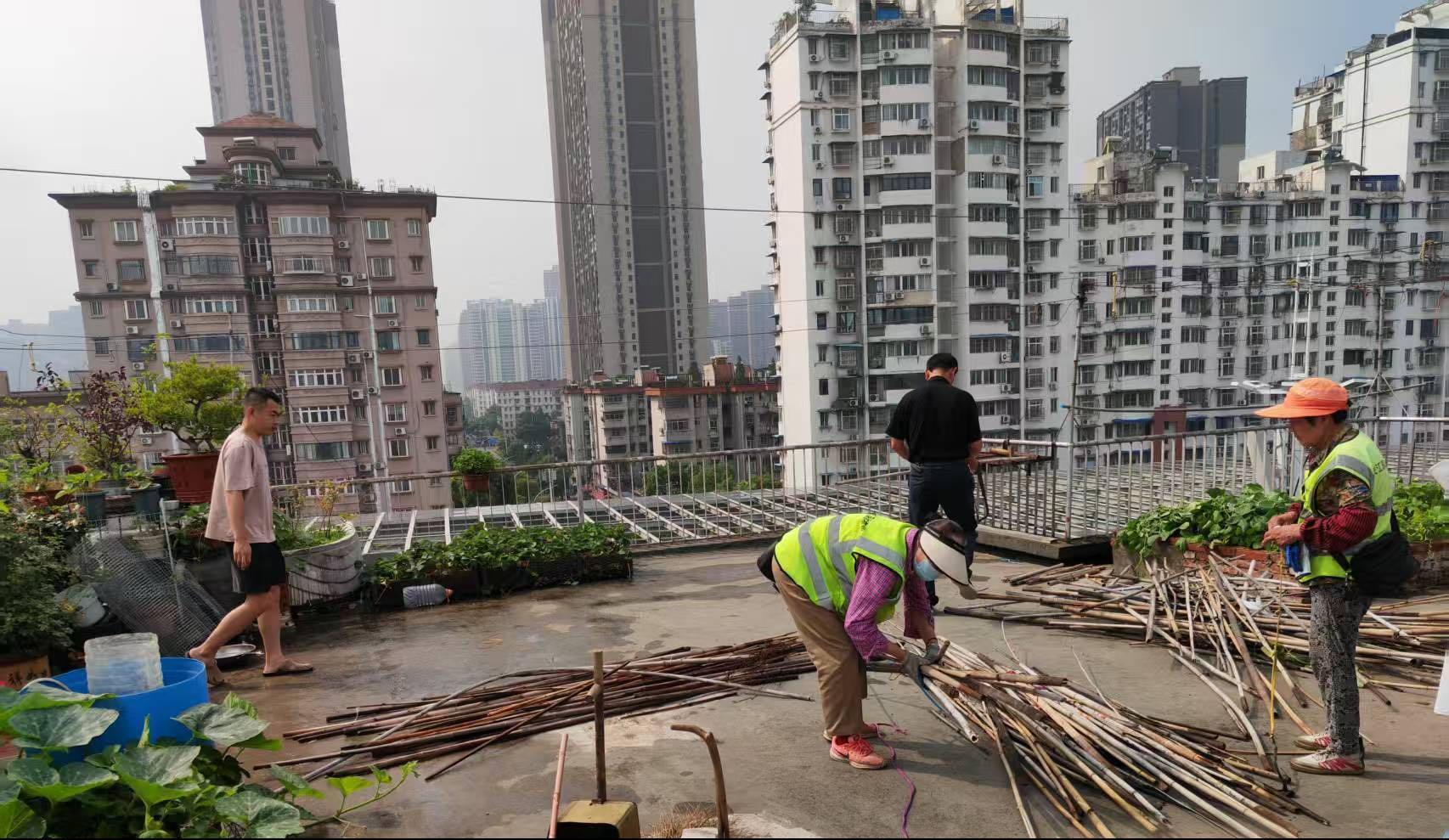 友谊大道沿线长期存在楼顶垃圾堆积、私搭花架、违规悬挂等问题,既影响市容环境,更威胁居民安全。此次行动以“清隐患、拆除私搭乱盖、美环境”为目标,重点对楼顶积存垃圾、竹竿铁网搭建、牵挂绳缠绕等乱象展开攻坚。工作人员冒高温、战脏乱,累计清理楼顶垃圾5吨,拆除竹竿500余根、铁网10余张、牵挂绳50余根,彻底清除卫生死角与安全隐患,还居民一片干净整洁的居住空间。