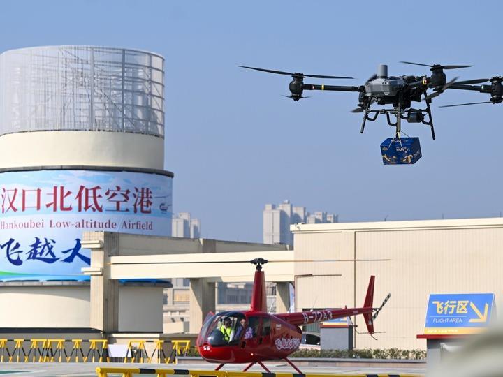 装配快递盒的无人机在汉口北低空港无人机停机坪起飞(新华社记者肖艺九摄)