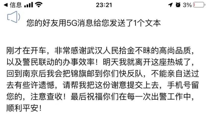 由于工作需要,高先生夫妇连夜驱车赶回南京,回程途中,高先生向刘伟发来短信:“感谢武汉市民拾金不昧的高尚品质,以及警民联动的办事效率,回去后,我一定会把锦旗寄到队里,注意查收。最后祝福你们在每一次出警工作中顺利、平安!”