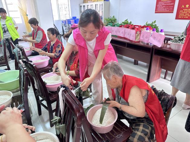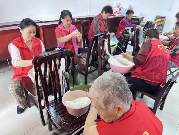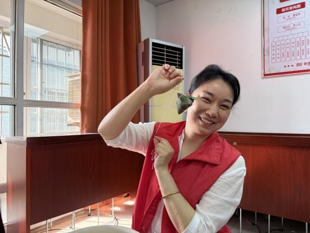 “两片粽叶折成斗,三把糯米裹成球”。兴盛社区三楼活动室里,欢声笑语此起彼伏,一场“粽叶飘香 端午情浓”包粽子比赛正火热进行中。提前备好的糯米颗颗饱满莹白,青绿的粽叶散发着淡淡清香,整齐排列在操作台。居民选手们围坐在一起,个个摩拳擦掌。一双双巧手上下翻飞,粽叶在指尖灵巧地翻转折叠,迅速裹成漏斗状,填入糯米压实,再用细绳娴熟地绕圈扎紧。指尖翻飞间,一只只棱角分明的粽子不断成型,很快便摆满了桌面,空气中弥漫着糯米与粽叶交融的独特香气,现场气氛热烈而温馨。