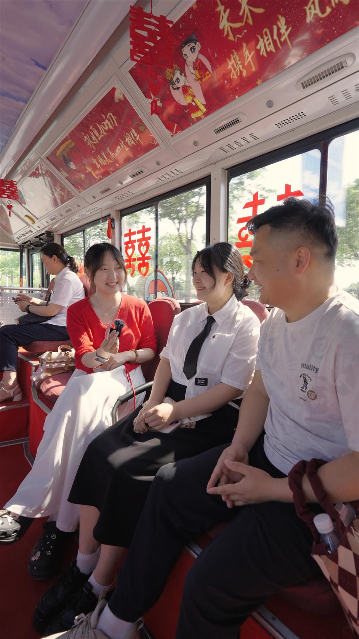 车厢内,“囍”字窗花与流苏灯笼透出东方韵味,车内传来《凤求凰》等经典情歌。当《今天你要嫁给我》的前奏响起,新人王先生牵起妻子的手加入合唱。“这种流动的仪式感太特别了,驶过的每个街角都像在收获城市的祝福。”王先生高兴地说。