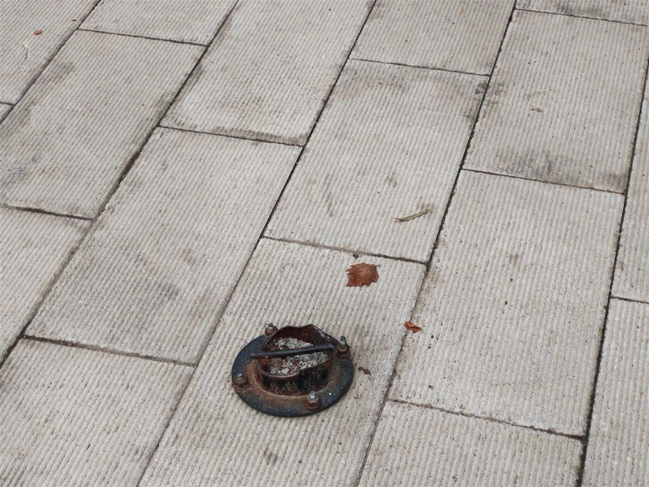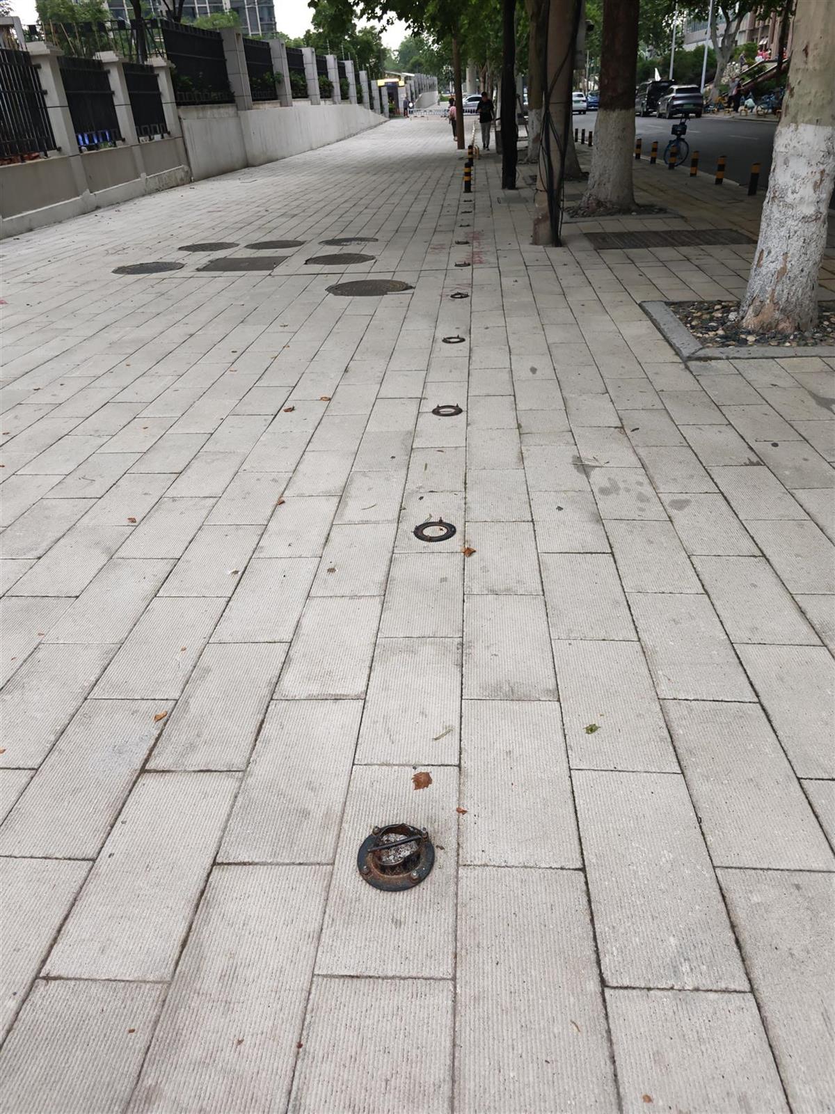 记者仔细观察后发现,这些螺丝钉原本是固定路桩的。不知何时,路桩被拆除了,但拆除工作却留下了“尾巴”——底座和螺丝钉都没有被清理干净,就这样遗留在了人行道上。