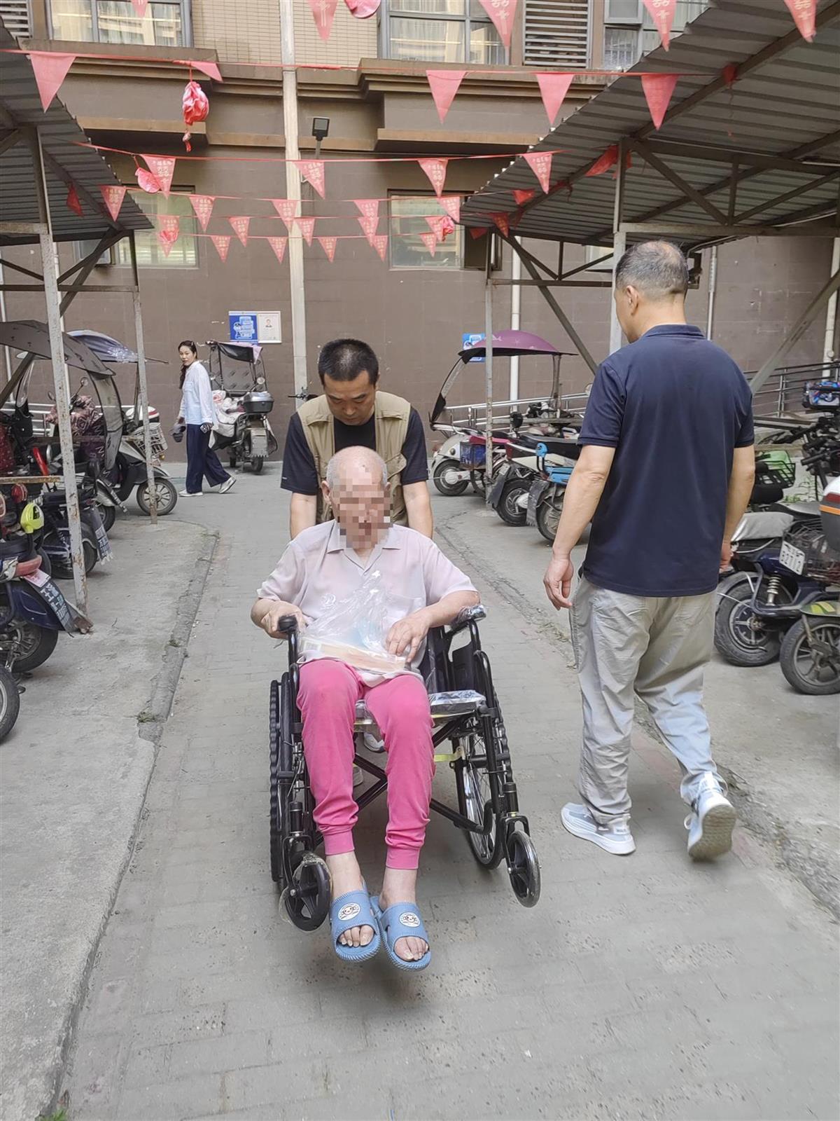 随后,工作人员仔细查看老人的身体状况,仔细询问老人身体哪个部位有疼痛感,感觉哪里不舒服。在确认老人意识清醒,身体并无大碍,只是有些轻微擦伤后,大伙悬着的心才稍稍放下。“联系社区居家养老服务中心,调一辆轮椅过来。”秦红红对旁边的工作人员说道。很快,工作人员便找来了一辆轮椅,大家慢慢地将老人搀扶上轮椅,在问清老人家庭住址后,送老人回家。