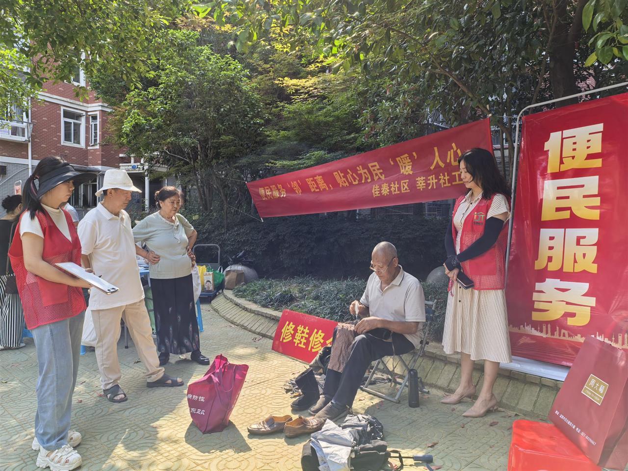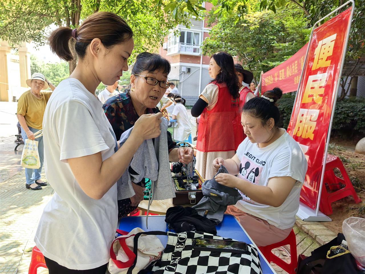 便民服务区域同样热闹有序。理发师傅们技艺娴熟,根据居民需求和喜好剪出满意发型,让居民焕然一新。缝纫摊位前,师傅专注修补居民送来的衣物,针线穿梭间解决衣物破损难题。磨刀师傅在摊位前反复打磨刀具,让钝刀重获锋利。修鞋修伞区域,师傅们专注修理,用精湛手艺为居民解决实际问题。