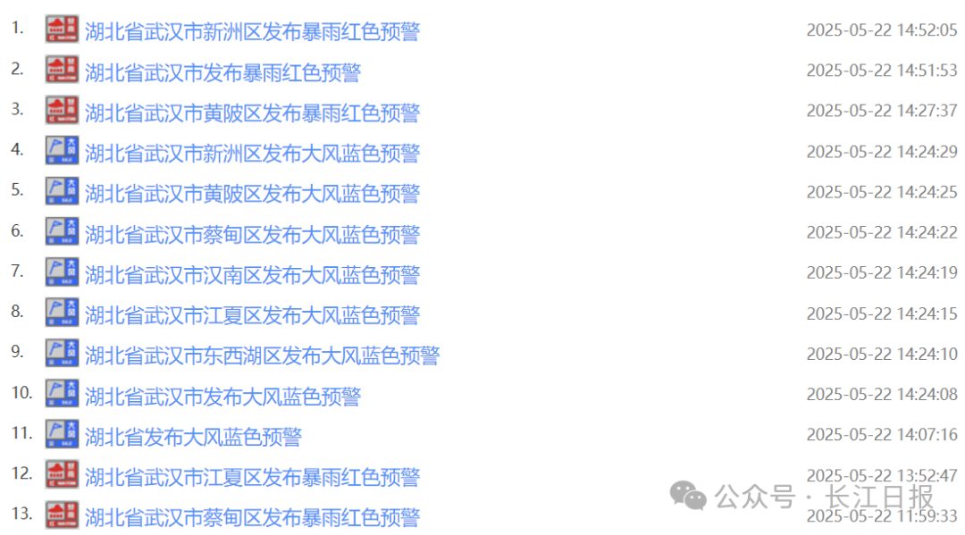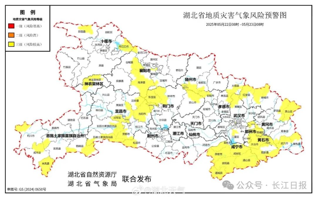 2025年05月22日08时—2025年05月23日08时,预计神农架林区中北部、十堰(郧西县中北部、丹江口市东部)、襄阳(襄城区、老河口市西部、谷城县东部、宜城市西部、南漳县)、宜昌市(点军区、猇亭区、伍家岗区、夷陵区东部、长阳土家族自治县东部、远安县东部、宜都市、当阳市、五峰土家族自治县)、恩施(恩施市西南部、利川市西北部、咸丰县北部、鹤峰县西部和东部、来凤县)、荆门(直属分局、东宝区、漳河新区、钟祥市西部、京山市北部)、荆州(松滋市西部)、随州(曾都区南部、随县南部、大洪山风景名胜区)、孝感(孝昌县东部、大悟县中部和南部、安陆市西北部)、武汉(汉阳区局部、黄陂区北部、武昌区局部、江夏区中部)、鄂州(鄂城区、梁子湖区、华容区局部、葛店开发区局部)、咸宁(咸安区、通山县、赤壁市、嘉鱼县、通城县、崇阳县)、黄石(西塞山区、铁山区、下陆区、开发区、大冶市、阳新县)、黄冈(黄州区、红安县、麻城市、罗田县东部、英山县、蕲春县西南部、武穴市、黄梅县北部)以及其他强降水区域发生崩塌、滑坡、泥石流的风险较高,请注意防范!
