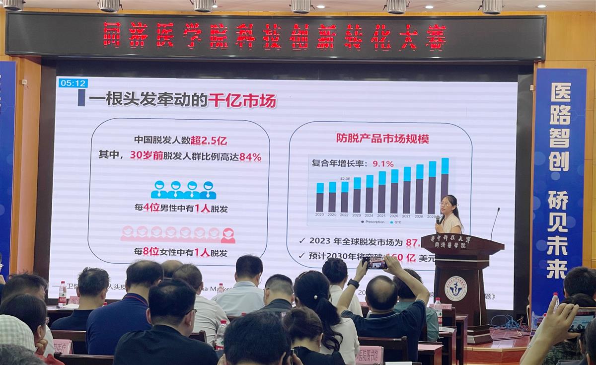 “我们研发的新型离子液体局部给药制剂,通过治疗可达到85%的头发覆盖率,是目前市售米诺地尔搽剂的2倍,可为脱发治疗提供安全高效的解决方案,目前已获得国家发明专利。”华中科技大学同济医学院药学院副教授杨丛莲介绍其路演项目,她负责的项目在本次大赛荣获三等奖。在现场举行的科技创新项目签约仪式上,同济医学院的12个科研项目与大健康企业进行意向签约。杨丛莲副教授与武汉医煜科技有限公司签约,后续将在研究开发、技术攻关、生产试验等方面开展合作。“我们的项目目前还处于实验室研究阶段,此次和企业签约,能够有效让科技成果加快走向临床、转化为产品。”杨丛莲说。