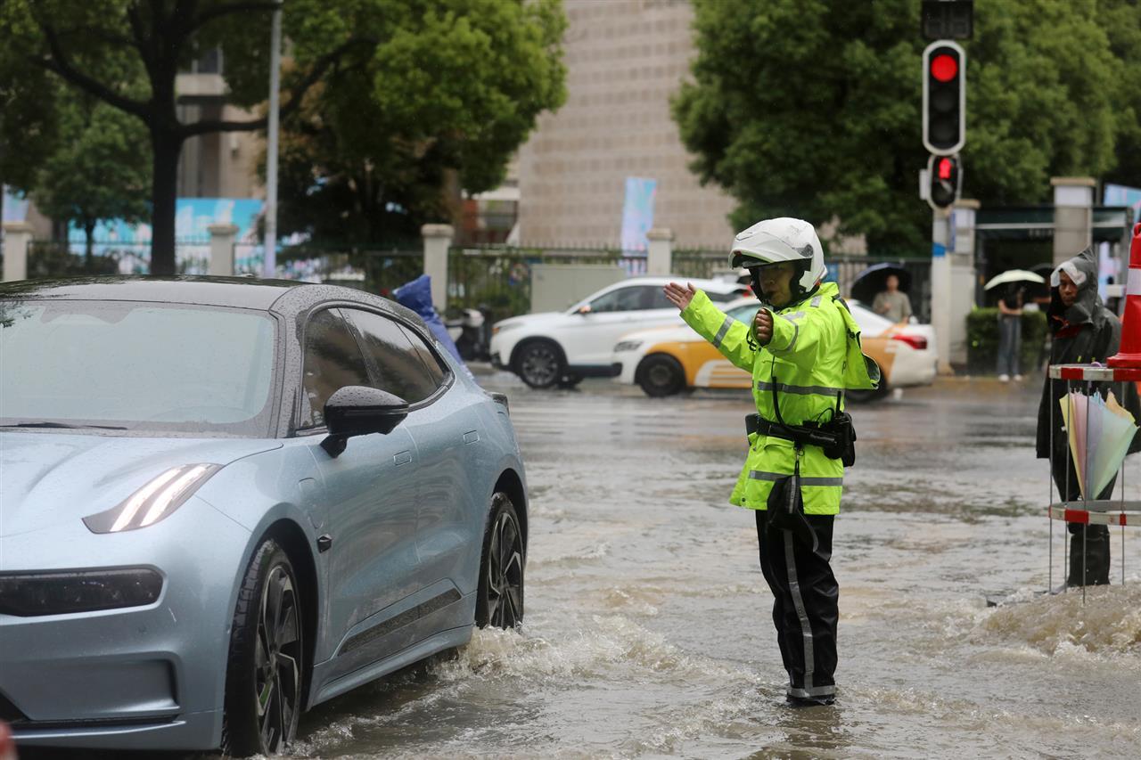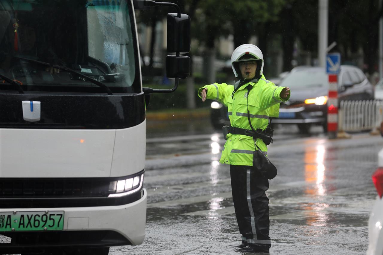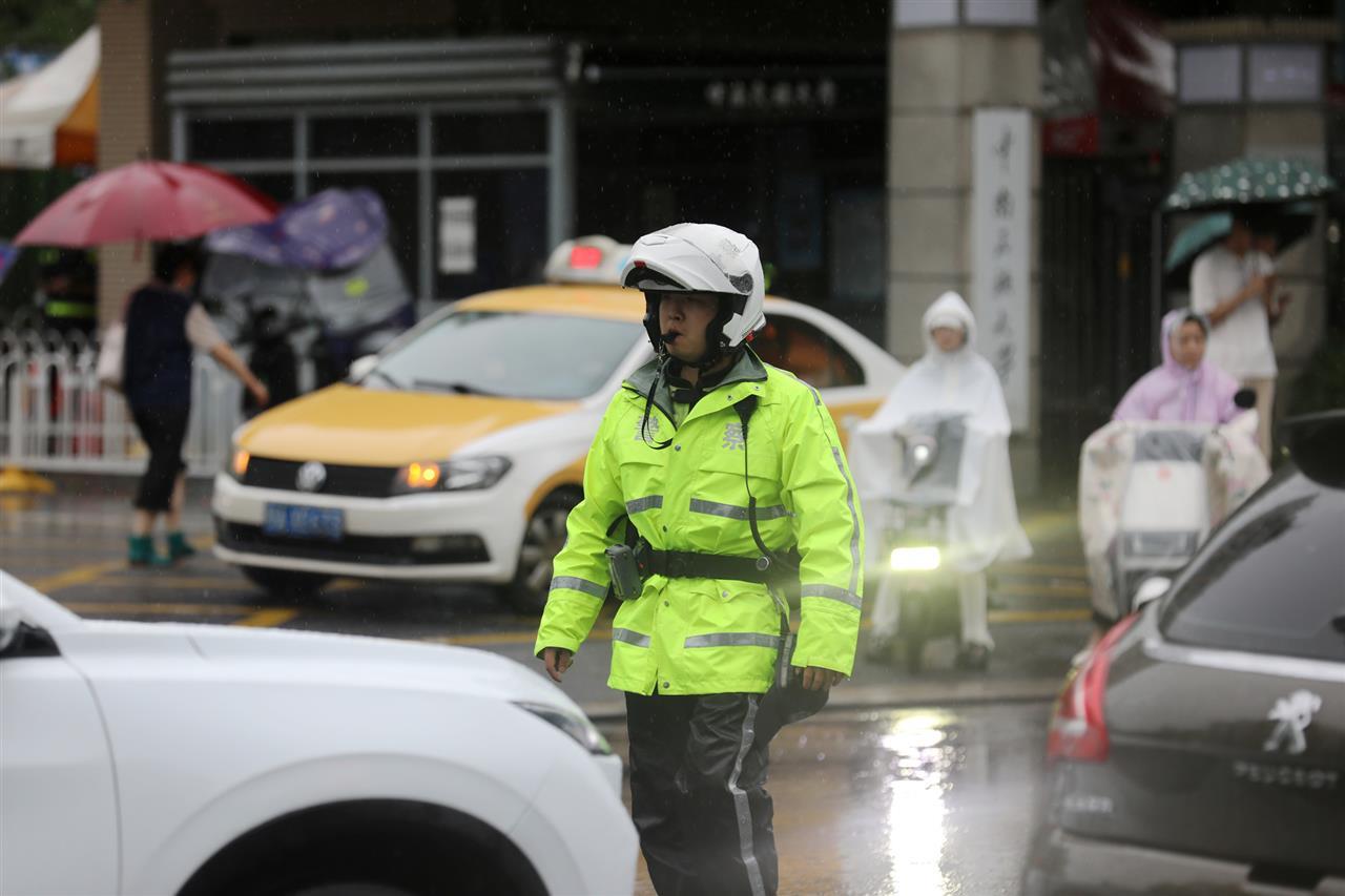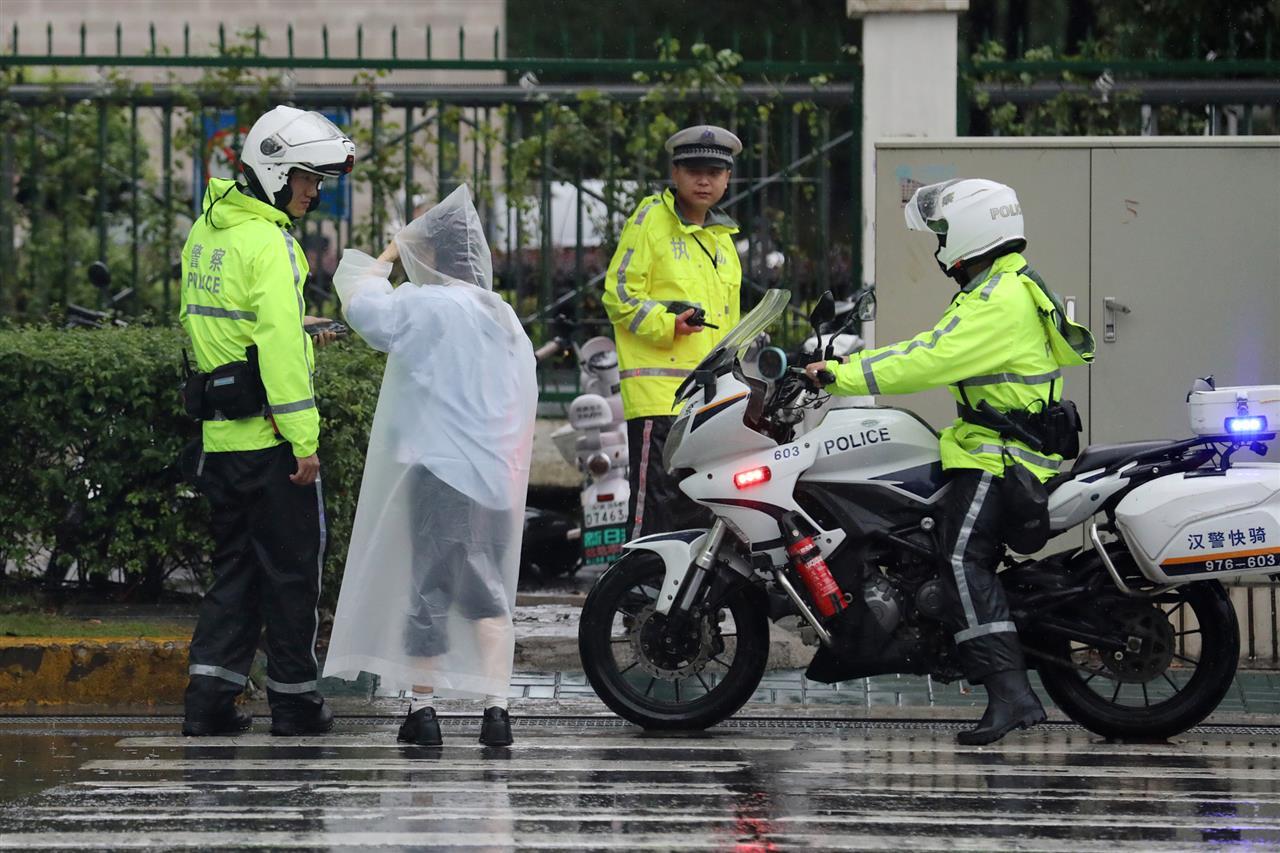 5月22日,又一轮暴风雨突袭江城。武汉市东湖高新区交通大队民警在新竹路与民族大道交会路口,对积水路段拉起警戒带并设置警示标志,提醒车辆驾驶人雨天路滑、谨慎驾驶,保障群众出行安全。