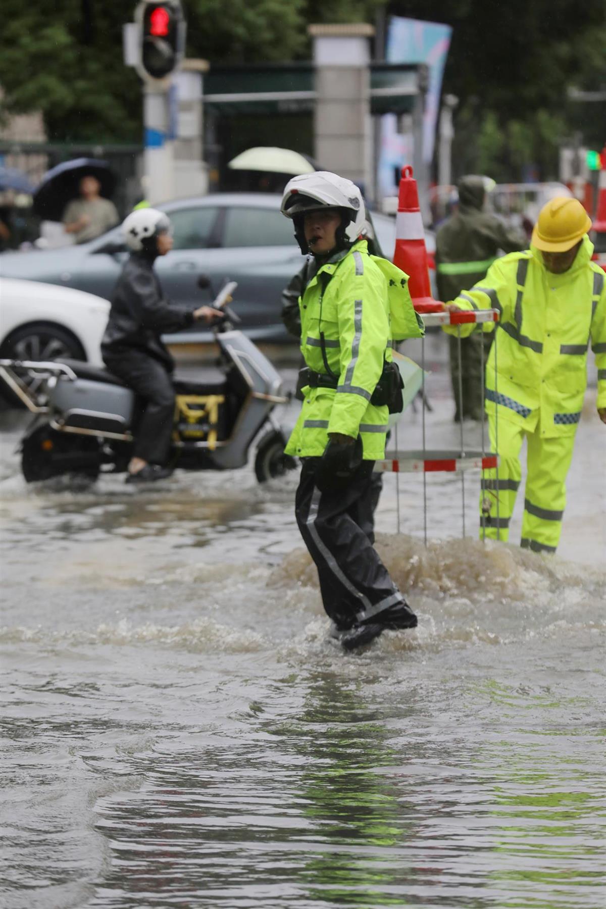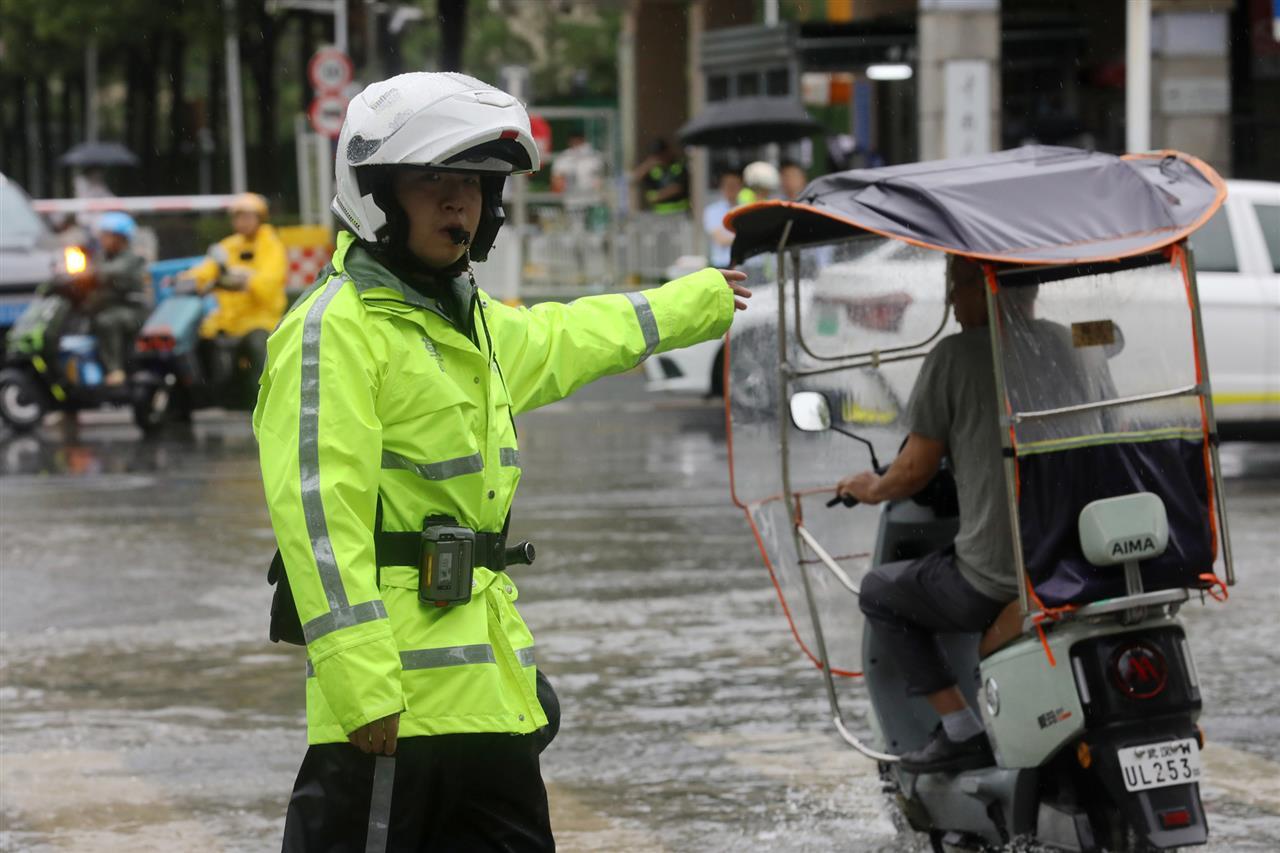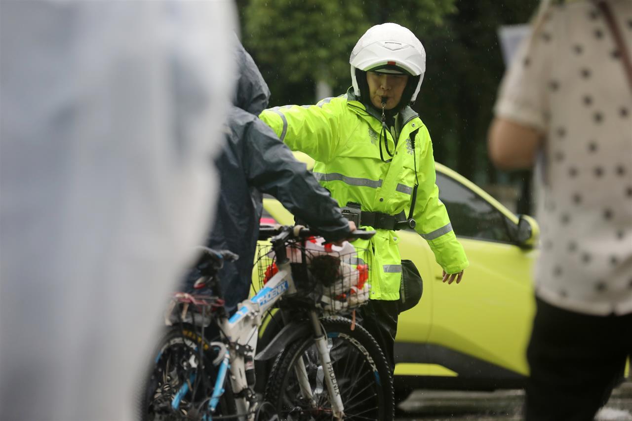 5月22日,又一轮暴风雨突袭江城。武汉市东湖高新区交通大队民警在新竹路与民族大道交会路口,对积水路段拉起警戒带并设置警示标志,提醒车辆驾驶人雨天路滑、谨慎驾驶,保障群众出行安全。