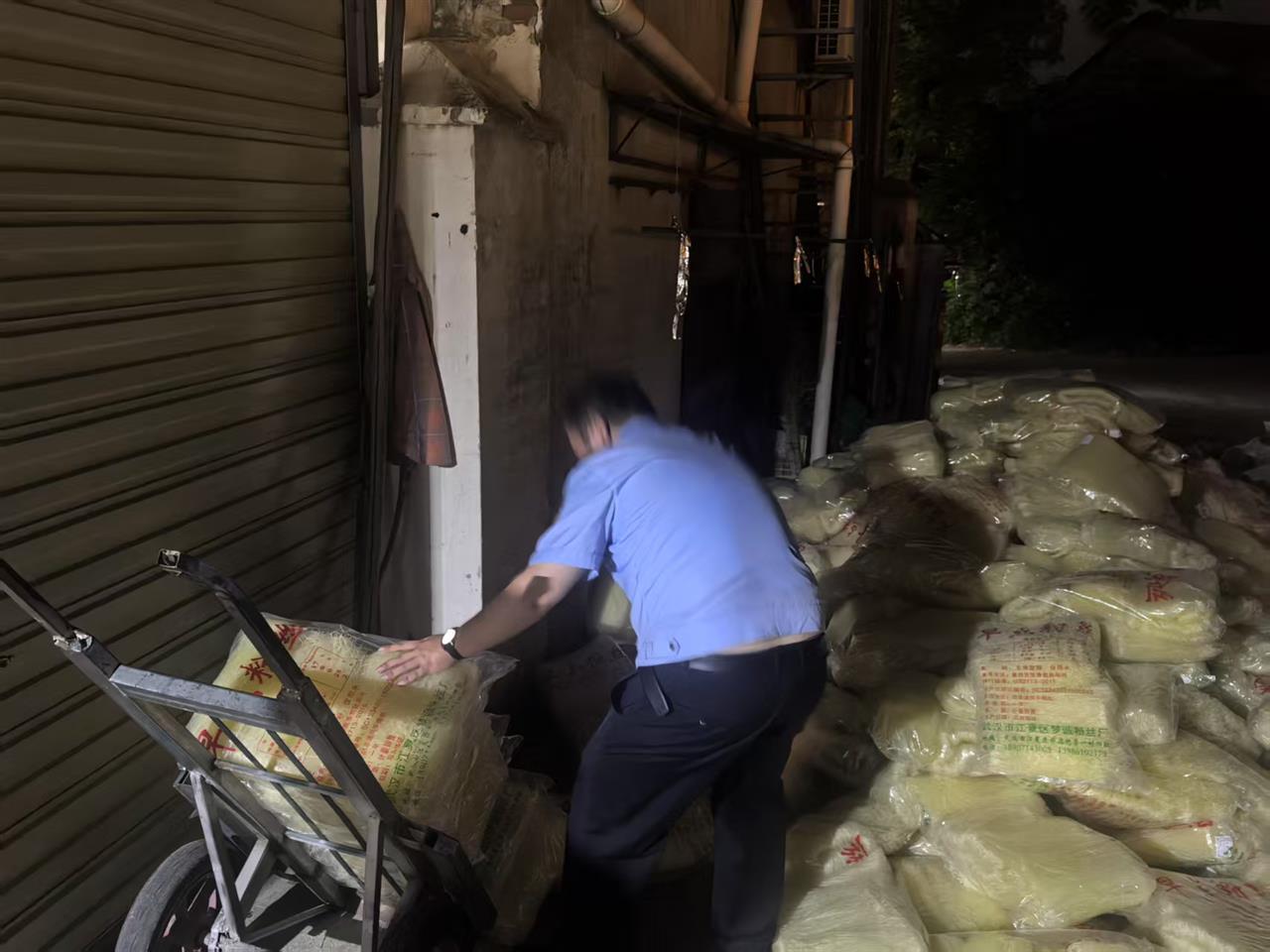 深夜,民警接警调解货运纠纷,但纠纷双方迟迟未能达成一致。眼见暴雨将至,民警从调解员化身搬运员,与辅警和众人一起,将4.2吨干米粉转移至安全区,成功避免了因暴雨造成的经济损失。5月21日深夜,这一幕发生在江夏区郑店街头。