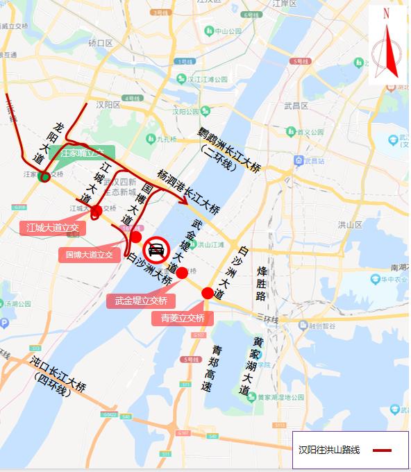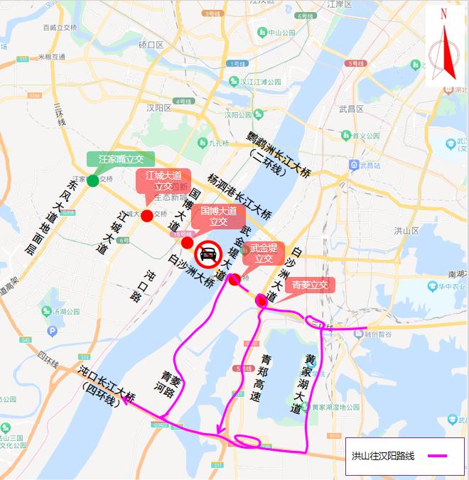 (二)由汉阳往洪山方向需通行白沙洲长江大桥的车辆,可通过国博大道立交绕行国博大道,或通过江城大道立交绕行江城大道,或通过汪家嘴立交绕行龙阳大道等周边道路通行杨泗港长江大桥。