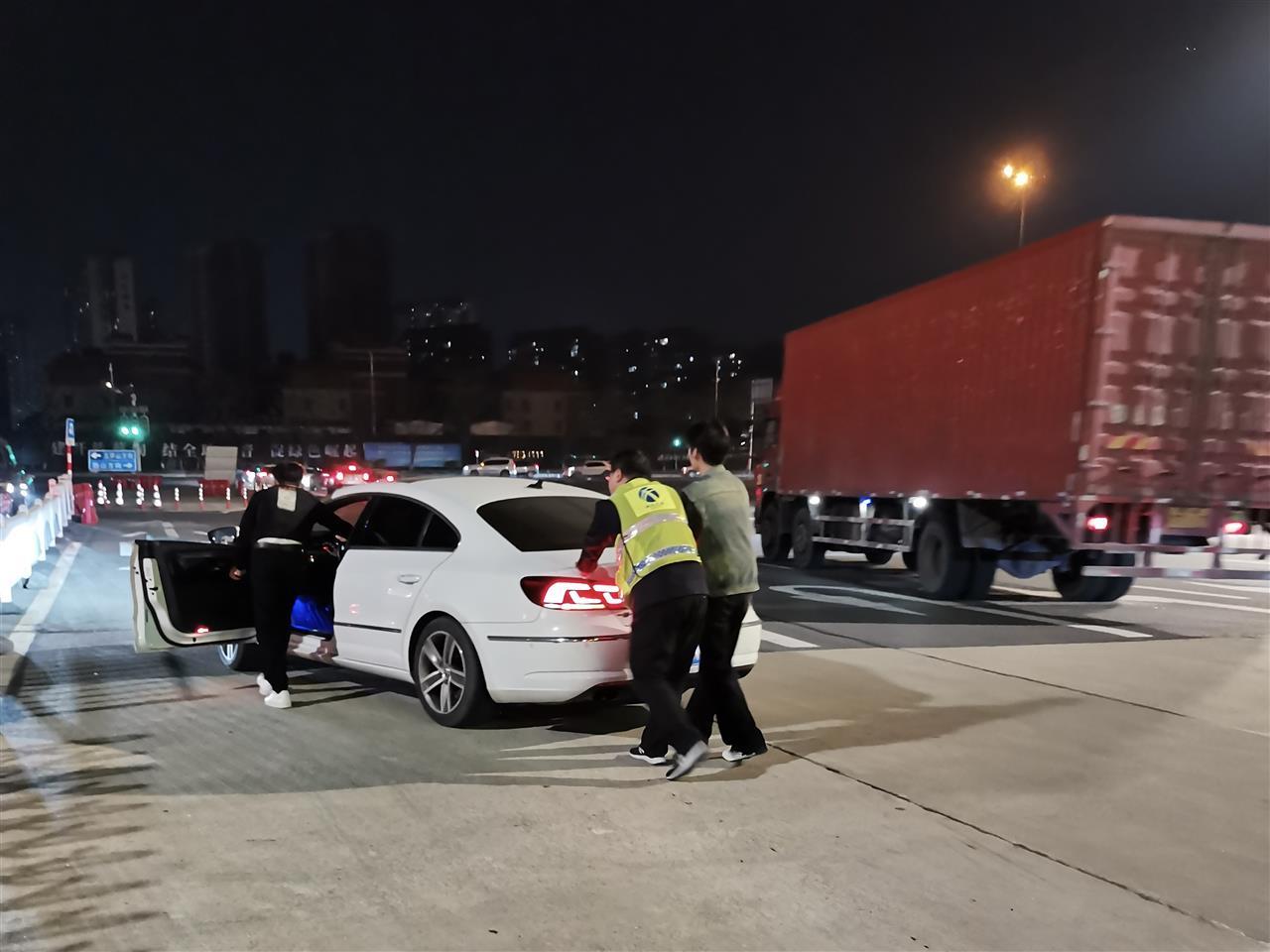 当班班长敏锐察觉到异常,迅速上前查看,发现车辆引擎盖不断冒出白烟。凭借丰富的应急经验,班长第一时间确认无明火隐患,随后立即协调当班人员,与何先生合力将车辆安全推至收费站外广场安全地带,并在车辆前后摆放反光锥桶,避免后方车辆积压引发拥堵。为最大限度减少何先生损失,工作人员随即联系附近修理厂,协助沟通维修事宜。