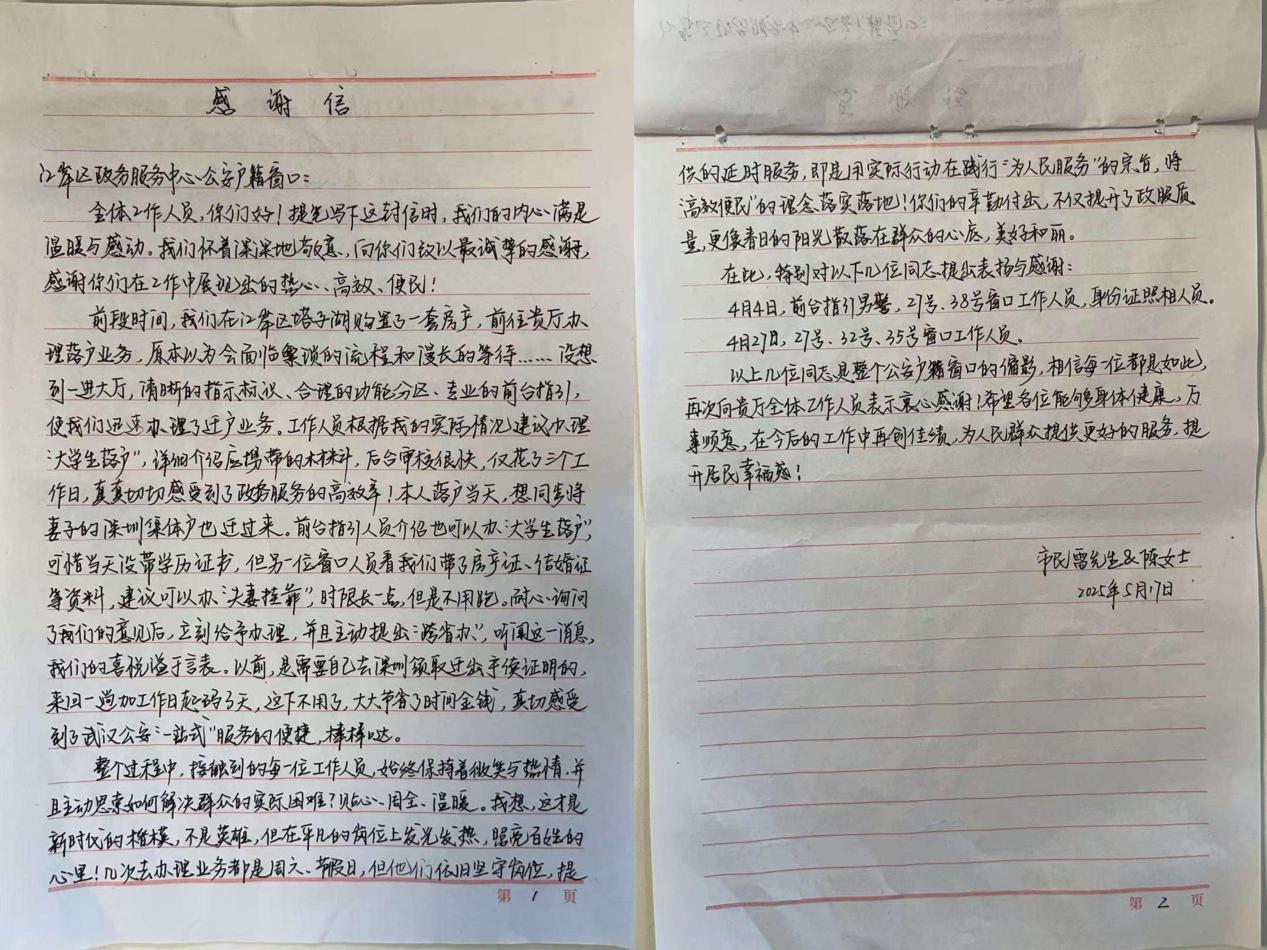 近日,刚刚从深圳落户武汉的陈女士和丈夫一起,来到江岸区政务服务中心赠送锦旗,锦旗上印着“政务服务有温度、办事又快又靠谱”“YYDS”,还送来一封两页纸的手写感谢信。