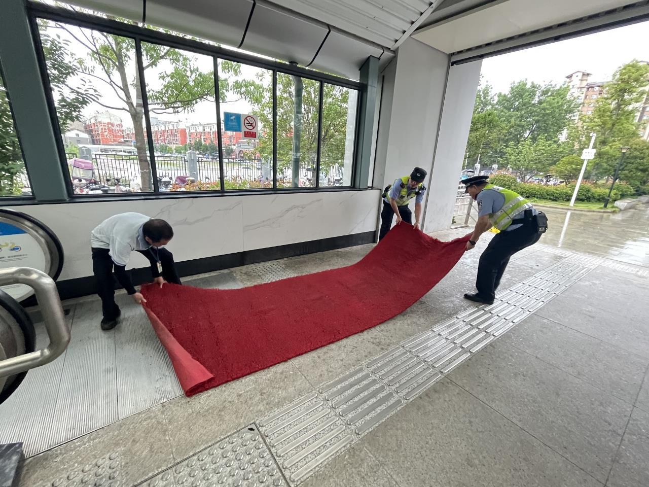 “别着急,我来帮您!”受强降雨影响,4号线武昌火车站负一层出现积水,乘客滞留在地铁站出入口。14时许,轨道公安分局民警吴长安迅速带领辅警赶赴C出口疏导客流,协助乘客通过临时通道有序离站。执勤过程中,吴长安发现一名怀抱幼儿的乘客行动不便,立即上前接过孩子。他小心翼翼地将幼儿护在怀中,冒雨护送母子安全出站。